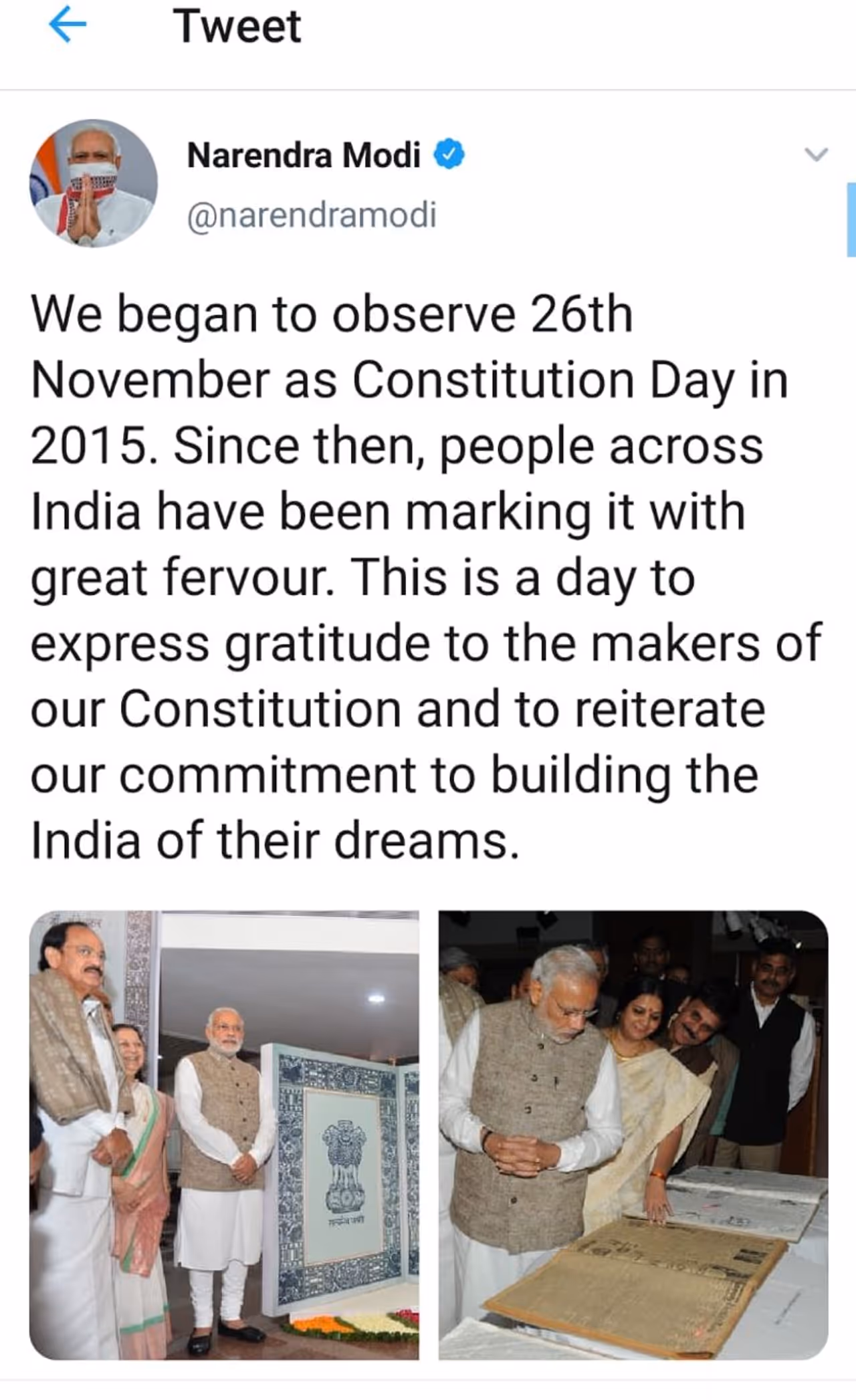 இந்திய தேசத்தையே வழிநடத்தும் அரசியல் அமைப்பு சட்டத்தை கொண்டாடும் வகையில் கடந்த 2015ஆம் ஆண்டு நவம்பர் 26ம் தேதி அரசியலமைப்பு தின கொண்டாட்டம் பாஜக அரசால் கொண்டாடப்பட்டு வருகிறது. அந்த வகையில் ஆறாவது ஆண்டாக பிரதமர் நரேந்திர மோடி இன்றும் அதை கொண்டாடியுள்ளார். 2019 ஆம் ஆண்டில், இந்த நாளைக் கொண்டாட பாராளுமன்றத்தின் கூட்டுக் கூட்டத்தில் முடிவு செய்யப்பட்டது. இந்நிலையில் இது குறித்து ட்விட்டரில் கருத்து தெரிவித்துள்ள பிரதமர் மோடி கடந்த 2015ஆம் ஆண்டு நவம்பர் 26ம் தேதி அரசியலமைப்பு தினமாக நாங்கள் கொண்டாடத் தொடங்கினோம்.