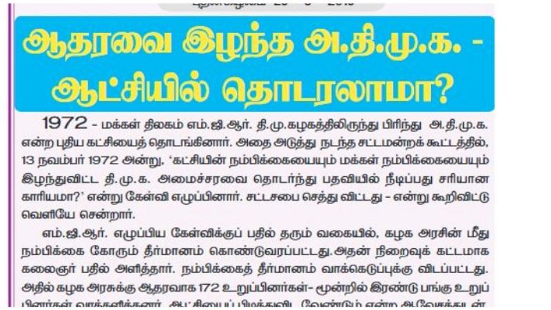 ஆதரவை இழந்த அதிமுக ஆட்சி தொடரலாமா? என்கிற தலைப்பில் திமுக நாளேடான முரசொலி நாளிதழில் தலையங்கம் பகுதில் அதிமுக ஆட்சியை கலைப்பது தொடர்பான கட்டுரை ஒன்று வெளியாகி இருக்கிறது. அதில், தமிழகத்தில் இப்போது நடைபெறும் ஓ.பி.எஸ் -ஈபிஎஸ் தலைமையிலான அதிமுக ஆட்சி பெரும்பான்மை வலிமையுடன் நடைபெறுகிறதா? நாட்டு மக்களின் நம்பிக்கையுடன் நடைபெறுகிறதா? என்றால் இல்லை என்று தான் நடுநிலைமையாளர்கள் உள்ளிட்ட அரசியல் நோக்கர்கள் விடை அளிப்பார்கள்.