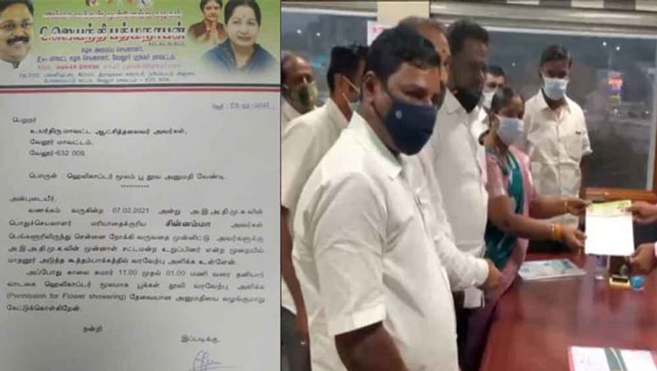 பெங்களூரிலிருந்து சென்னை திரும்பும் சசிகலாவுக்கு ஹெலிகாப்டர் மூலம் மலர் தூவி வரவேற்பு அளிக்க அனுமதி வழங்க வேண்டும் என குடியாத்தம் தொகுதியின் முன்னாள் எம்எல்ஏ ஜெயந்தி பத்மநாபன் மாவட்ட ஆட்சியரிடம் அனு அளித்துள்ள சம்பவம் அதிர்ச்சியை ஏற்படுத்தியுள்ளது.