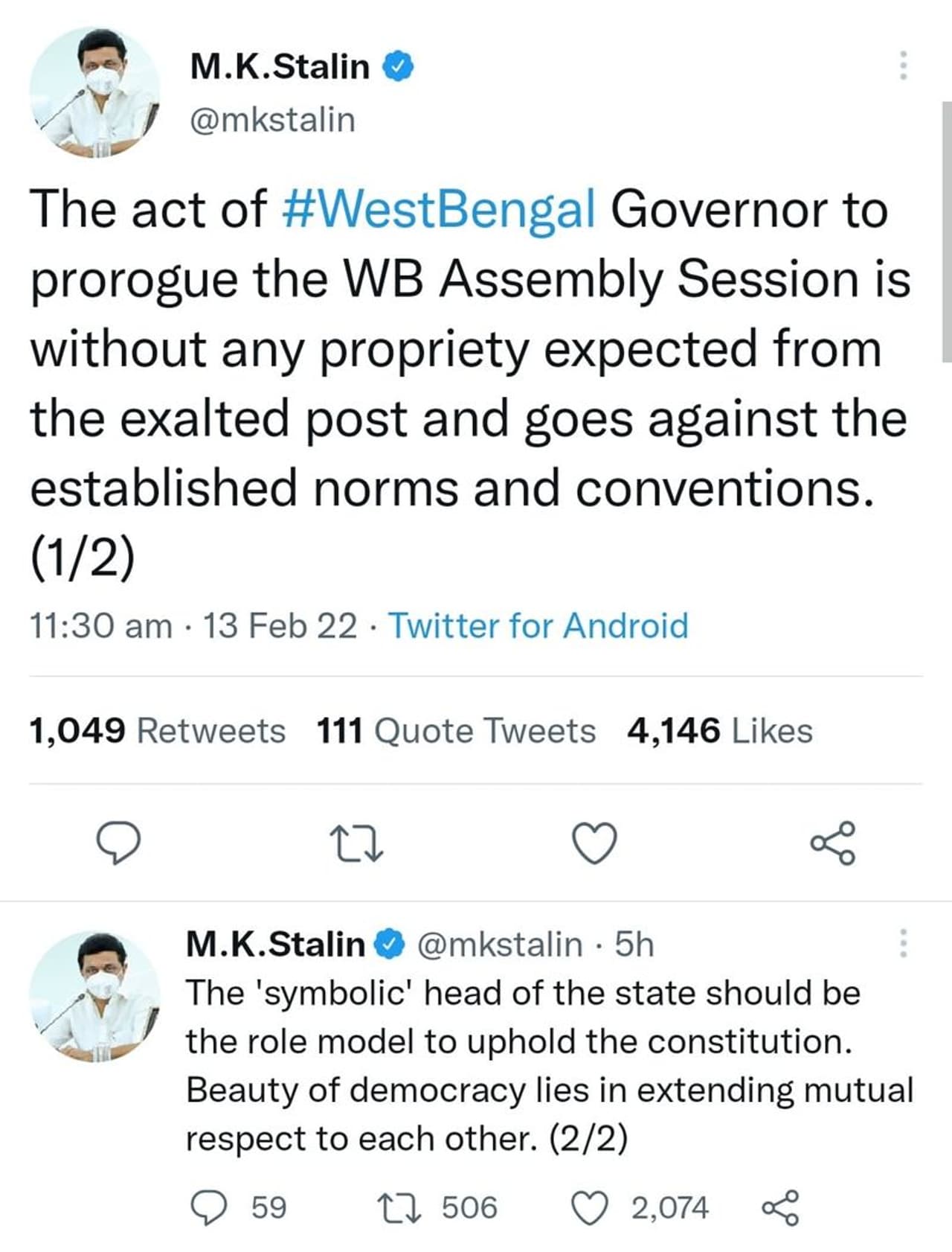 இந்நிலையில், முதலமைச்சர் மு.க.ஸ்டாலின் வெளியிட்டுள்ள ட்விட்டர் பதிவில், ஒரு மாநிலத்தின் தலைவராக உள்ள ஆளுநர், அந்த மாநிலத்திற்கு ரோல் மாடலாக இருக்க வேண்டும் என குறிப்பிட்டுள்ளார். மேற்குவங்க ஆளுநரின் செயல் விதிமுறைகள் மற்றும் மரபுகளுக்கு எதிரானது எனவும் தெரிவித்துள்ளார்.