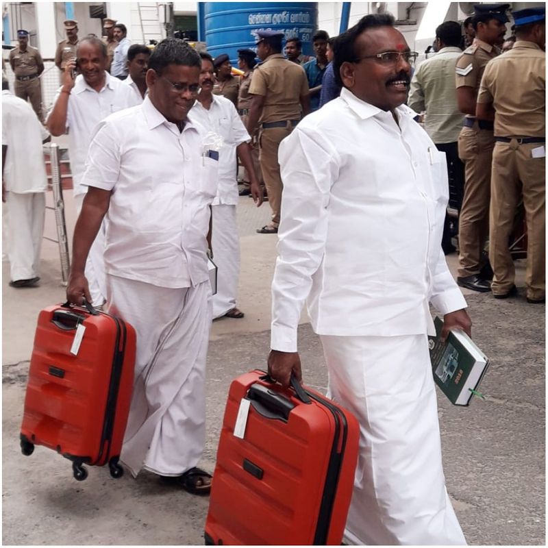 ஒவ்வொரு பையிலும், 3 ஹாட்பாக்ஸ்களில் இந்த பிரியாணி வழங்கப்பட்டது. அத்துடன் சிக்கன் அயிட்டங்களும் வழங்கப்பட்டன. மாலை சுற்றுச்சூழல் விவாதம் தொடங்கி முடிந்த பிறகு அத்துறை அமைச்சர் கே.சி.கருப்பணன் அனைத்து எம்.எல்.ஏக்களுக்கும் விலையுயந்த சூட்கேஸை பரிசளித்தார். இதில் ஆச்சர்யம் என்னவென்றால் திமுக கட்சியின் நிறமான கருப்பு சிவப்பு கலரில் இருந்தன அந்த சூட்கேஸ்கள். அதிமுகவுக்கு பிடிக்காத கலர் அது.