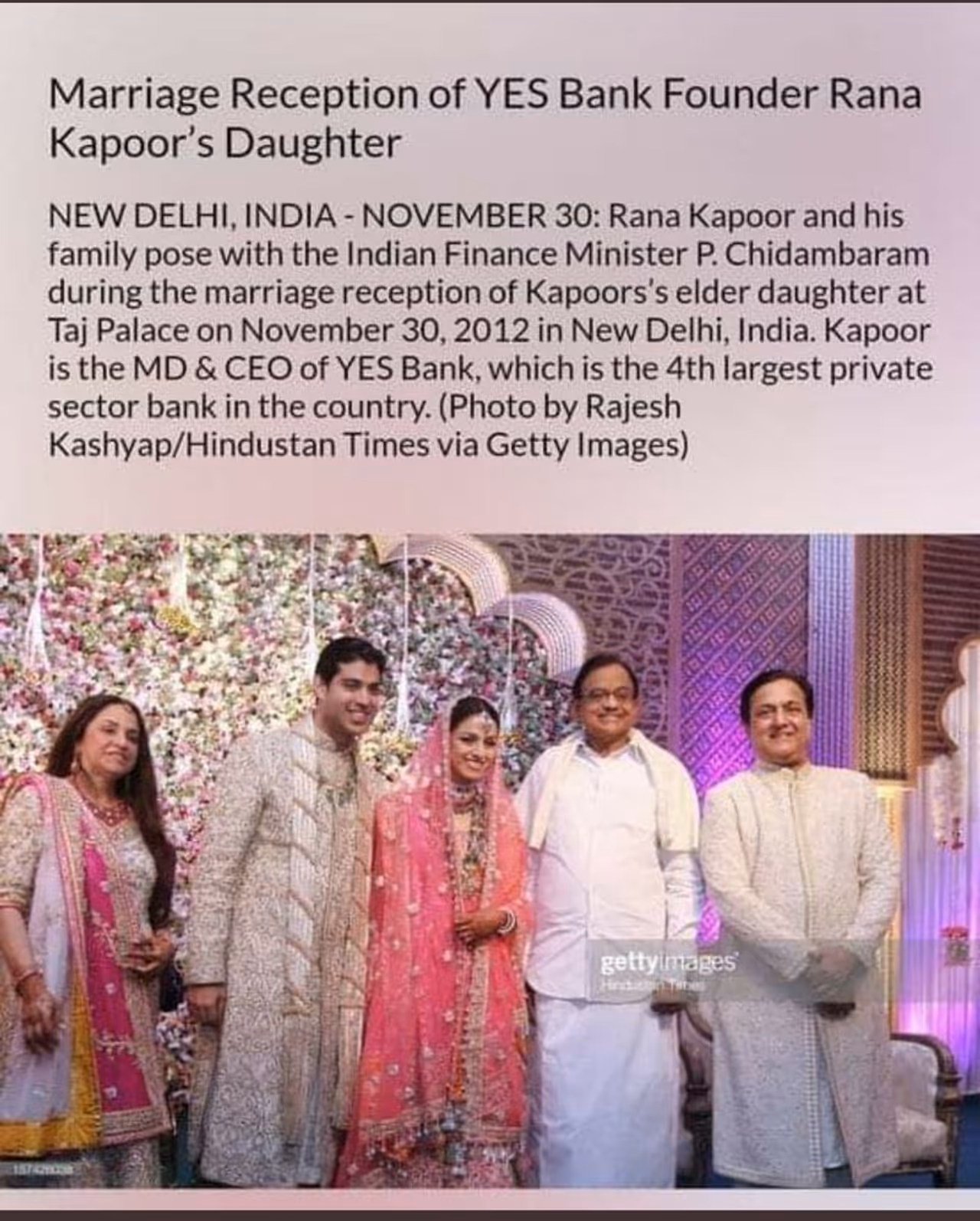 2012ம் ஆண்டு நவம்பர் 30ம் தேதி யெஸ் வங்கியின் நிர்வாக இயக்குனர் ராணா கபூர் மகள் திருமண வரவேற்பில் மத்திய நிதியமைச்சர் ப.சிதம்பரம் கலந்துகொண்ட புகைப்படம் தற்போது வைரலாகி வருகிறது.