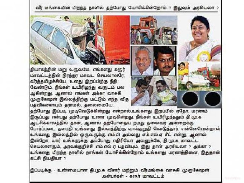 ஆனால், தற்போதைய நமது தலைவர் அன்றைக்கு போர்படை தளபதி உங்களது இல்லத்திற்கு வந்து வாக்குறுதி கொடுத்தார். என்னவென்றால் உங்களது இல்லத்தில் ஒருவருக்கு எம்.பி அல்லது எம்.எல்.ஏ சீட் என்று கூறினார். இன்றோ யார் உங்களுக்கு அப்போது எதிரியோ அவருக்கே மாவட்ட செயலாளர், எம்.எல்.ஏ பதவியை கொடுத்துள்ளார். இது தான் அரசியலா? உங்களது பிறந்த நாளில் உங்களது மரணம் பற்றி சந்தேகம் வருகிறது’’ எனக்கூறி போஸ்டர்கள் அடித்து வருகின்றனர். அத்துடன் வாசுகியின் கார் விபத்துக்குள்ளான புகைப்படத்தையும் பகிர்ந்துள்ளனர். இது கரூர் திமுகவினரிடையே அதிர்ச்சியை ஏற்படுத்தி உள்ளது.