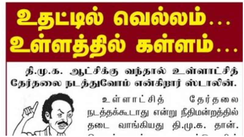 திமுகவின் உள்ளும் புறமுமான வெளிவேஷமும் பகல் வேஷமும் என்றிருக்க இப்போது, உள்ளாட்சித் தேர்தலுக்கு தடை வாங்கியவர்களே ஆட்சிக்கு வந்தால் உள்ளட்சித் தேர்தலை உடனே நடத்துவோம் என்கிறார்கள் என நமது அம்மா நாளிதழ் திமுகவை கடுமையாக விமர்சித்துள்ளது.
