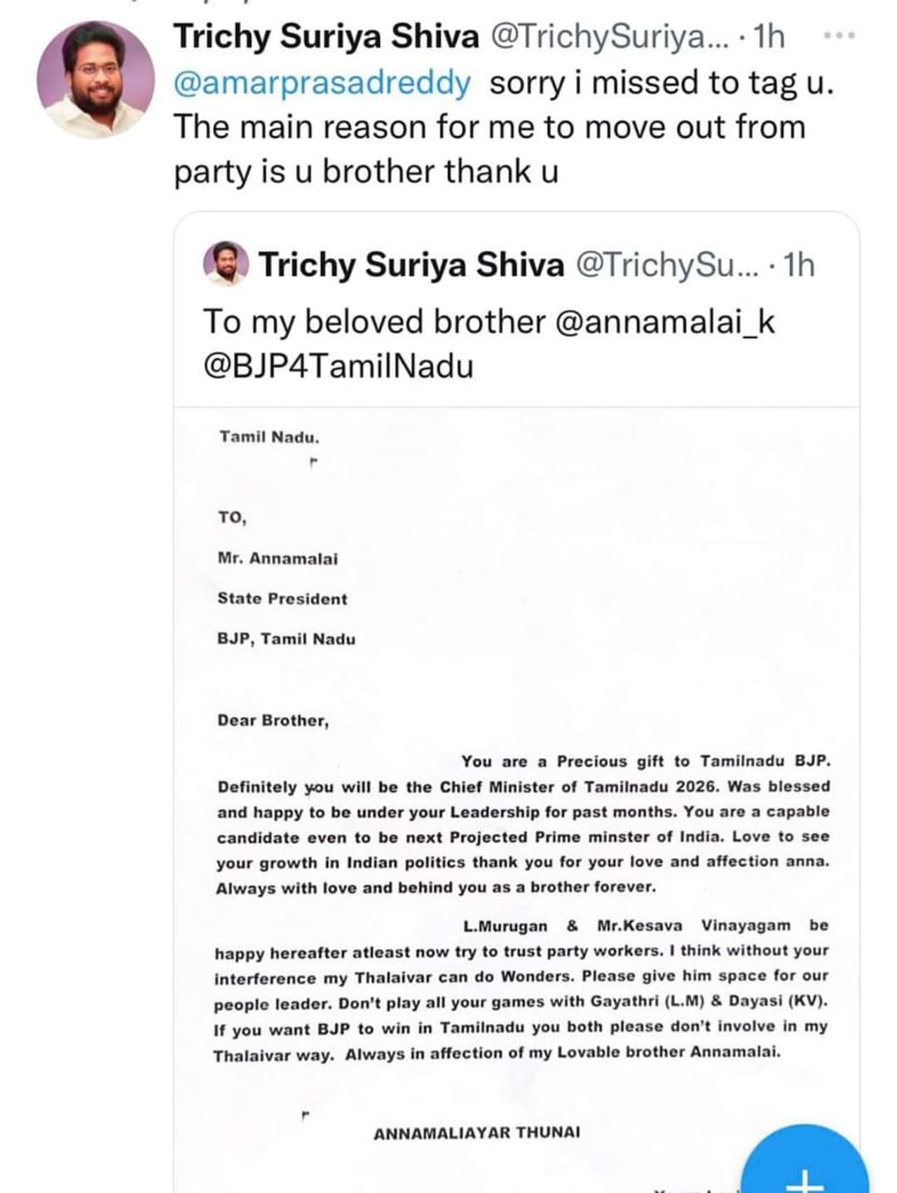 இந்தநிலையில் அந்த கடிதத்தை மீண்டும் பாஜக விளையாட்டு பிரிவு அணியை சேர்ந்த அமர் பிரசாத் ரெட்டியை டேக் செய்து உங்களையும் இதில் டேக் செய்ய மறந்துவிட்டேன். நான் கட்சியில் இருந்து வெளியேறுவதற்கு நீங்கள் தான் முக்கியமான காரணம். நன்றி அண்ணா பதிவு செய்துள்ளார். இந்த பதிவு பாஜக நிர்வாகிகள் மற்றும் சமூக வலை தளத்தில் பரவிய நிலையில் அந்த டுவிட்டை சூர்யா சிவா திடீரென டெலிட் செய்துள்ளார்.
