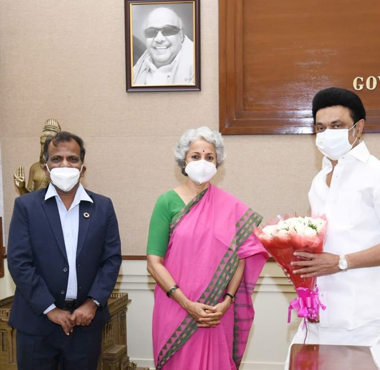 தமிழகத்தில் ஒமைக்ரான் தோற்று வேகமாக பரவி வரும் நிலையில், தமிழக அரசும் பல்வேறு நோய் தடுப்பு நடவடிக்கைகளில் தீவிரம் காட்டி வரும் இந்நிலையில் உலகச் சுகாதார நிறுவனத்தின் தலைமை விஞ்ஞானி சௌமியா சுவாமிநாதன் தமிழக முதலமைச்சரை சந்தித்துள்ளார். அதற்கான புகைப்படத்தை முதல்வர் தனது ட்விட்டர் பக்கத்தில் பகிர்ந்துள்ளார். இந்த நெருக்கடியான நிலையில் இந்த சந்திப்பு மிக முக்கியத்துவம் வாய்ந்ததாக பார்க்கப்படுகிறது.