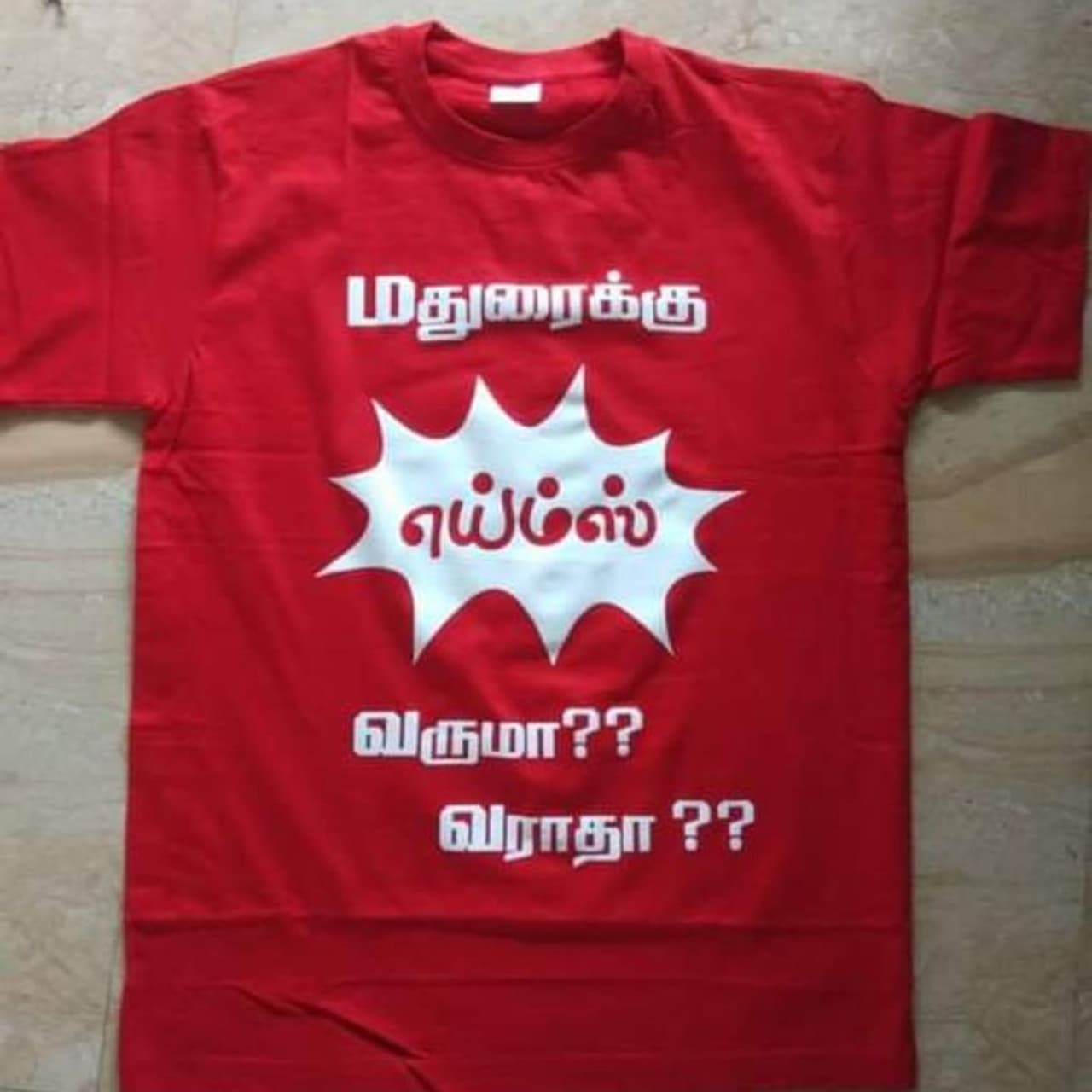 மதுரை எம்பி வெங்டேசன், ‘புல்புல் பறவைகள் மூலம் 95 சதவிகித வேலையைக் கட்டி முடித்த மதுரை எய்ம்ஸ் கடிதத்தைத் தேடி நானும் மாணிக்கம் தாகூர் போனோம். கீழ்வானம் வரை மதுரை கிழவி வெற்றிலை போட்டு துப்பிய எச்சிலால் சிவந்து கிடந்தது நிலம்’ என்று நக்கலாக பதிவிட்டு இருந்தார். மத்திய அரசான பாஜகவை நெட்டிசன்கள் பங்கமாக கலாய்த்து வருகின்றனர். இந்த நிலையில் மதுரைக்கு எய்ம்ஸ் வருமா ? வராதா ??’ என்ற புதிய டி-சர்ட் சந்தைக்கு வந்துள்ளது. இது மேலும் பரபரப்பை கிளப்பியிருக்கிறது.