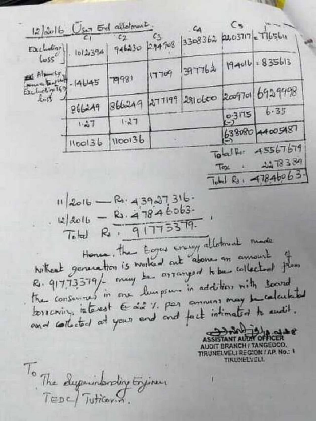 தமிழ்நாடு மின் உற்பத்தி மற்றும் பகிர்மானக் கழகத்தில் உள்ள திருநெல்வேலி மண்டல ஆடிட் பிராஞ்சின் உதவி ஆடிட் அதிகாரி தனது அறிக்கையில், உற்பத்தியே ஆகாத காற்றாலையின் பெயரில் 9 கோடியே 17 லட்சத்து 3 ஆயிரத்து 379 ரூபாய் மதிப்புள்ள காற்றாலை மின்சாரம் பெறப்பட்டதாக போலி ஒதுக்கீடு கணக்கு காட்டப்பட்டுள்ளதாக குறிப்ட்டுள்ளதை சுட்டிக்காட்டியுள்ளார்.