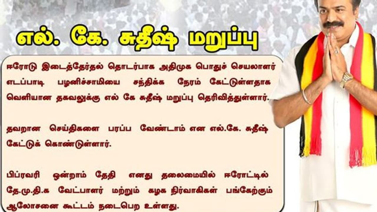 இதுகுறித்து தேமுதிக துணை செயலாளர் எல்.கே.சுதீஷ் வெளியிட்டுள்ள டுவிட்டர் பதிவில்;- ஈரோடு கிழக்கு இடைத்தேர்தல் தொடர்பாக எடப்பாடி பழனிசாமியை சந்திக்க உள்ளதாக வெளியான தகவலில் உண்மையில்லை. தவறான செய்திகளை பரப்ப வேண்டாம். வரும் 1-ம் தேதி ஈரோட்டில் தனது தலைமையில் இடைத்தேர்தலில் போட்டியிடும் வேட்பாளர் மற்றும் நிர்வாகிகள் கூட்டம் நடைபெறவுள்ளது என தெரிவித்துள்ளார்.