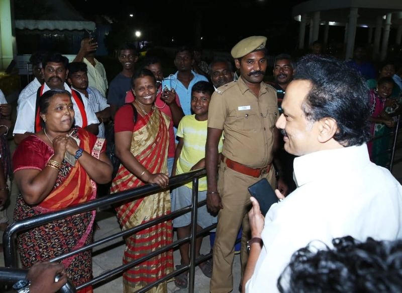 திமுக தலைவர் ஸ்டாலின் நேற்று மாலை மெரினா கடற்கரையில் அமைந்துள்ள கருணாநிதியின் நினைவிடத்திற்கு சென்றிருந்தார், அப்போது அவருடன் டிகேஎஸ் இளங்கோவன், தயாநிதிமாறன், உள்ளிட்ட திமுக முன்னணி தலைவர்கள் உடன் இருந்தனர். அப்போது சோழிங்கநல்லூர் பகுதியைச் சேர்ந்த முத்துக்குமார்-ஞானாம்பிகை என்ற தம்பதியினர் மற்றும் திருநெல்வேலி மாவட்டம் கடையநல்லூரைச் சேர்ந்த அவர்களது உறவினர்களும் மறைந்த திமுக தலைவர் கருணாநிதி நினைவிடத்தை காண வந்திருந்தனர். அப்போது ஞானாம்பிகை திராவிட முன்னேற்றக் கழகத் தலைவர் ஸ்டாலினை பார்த்து கையசைத்தார், அதைக்கண்ட ஸ்டாலின் அவர்களை அருகில் அழைத்து பேசினார்.
