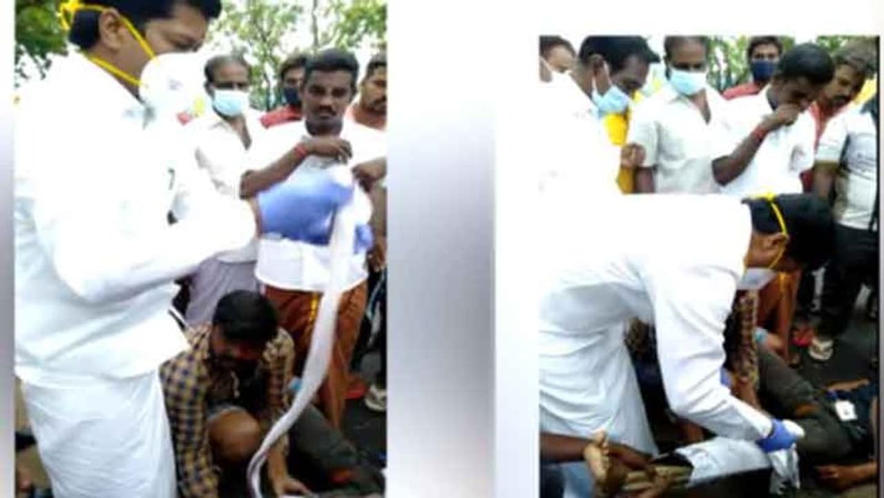 விழுப்புரத்தில் சாலை விபத்தில் சிக்கி கால் முறிந்து வலியால் துடித்த இளைஞருக்கு மருத்துவரான டாக்டரும் திமுக எம்எல்ஏ லட்சுமணன், கட்சி கரை வேட்டியைக் கிழித்துக் கட்டுப்போட்டு முதலுதவி அளித்த வீடியோ வைரலாகி வருகிறது.