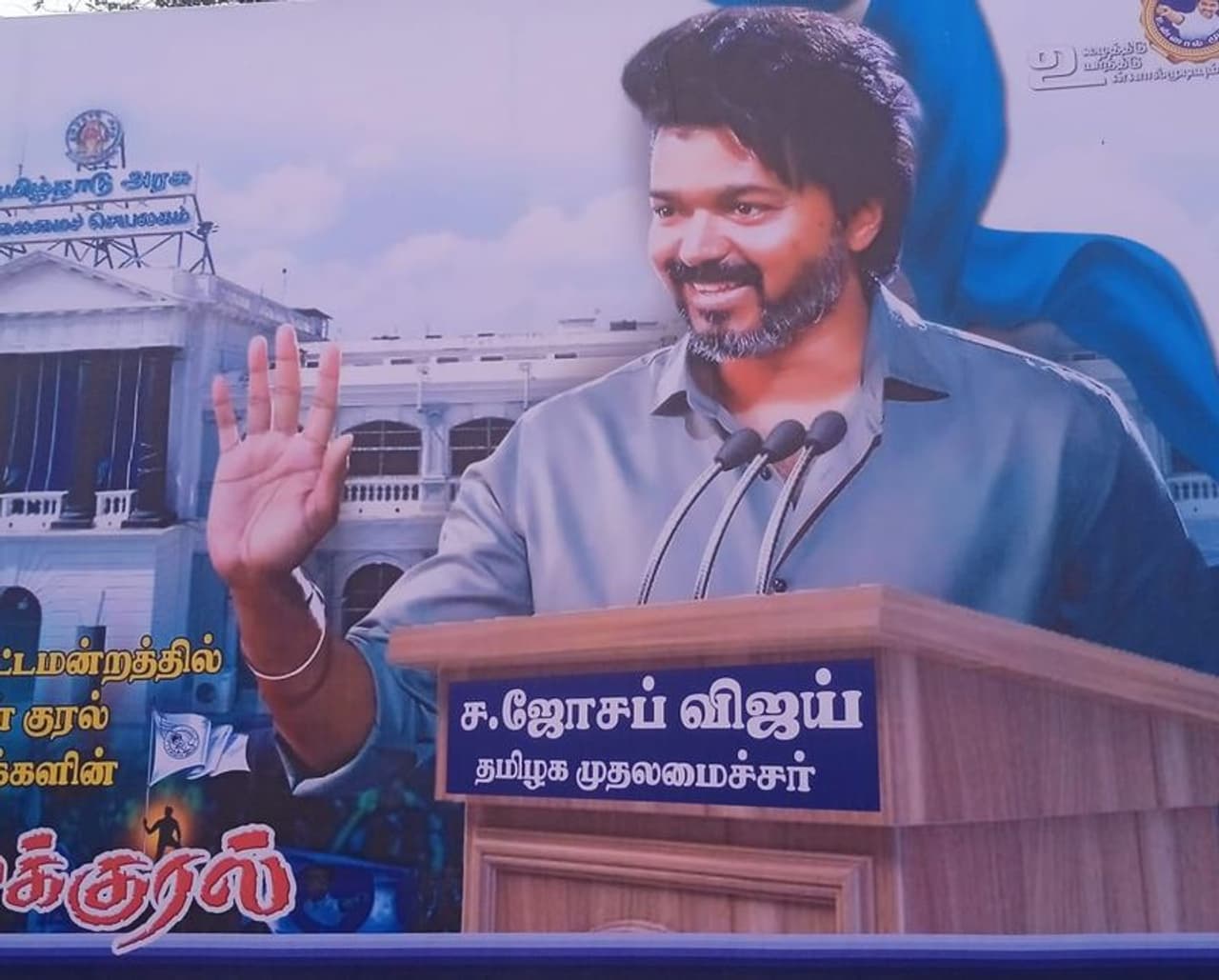 அந்த பேனரில் தமிழ்நாடு சட்டமன்றம் பின்னால் இருப்பது போன்றும் அதற்கு முன்னே டேபிள் முன் நின்று கொண்டு நடிகர் விஜய் பேசுவது போன்றும் பேனர் வைக்கப்பட்டுள்ளது. அந்த பேசும் டேபிள் முன் பக்கம் ச.ஜோசப் விஜய் தமிழக முதலமைச்சர் என்று எழுதப்பட்டு வைக்கப்பட்டுள்ளது. மேலும் 2026 -ல் தமிழக சட்டமன்றத்தில் உங்கள் குரல் மக்களின் உரிமை குரல் என்றும், ஆளப்பிறந்தவர் தளபதி என்ற வாசகங்கள் பேனரில் பொறிக்கப்பட்டுள்ளது. தற்போது இந்த பேனர் இணையத்தில் வைரலாகி வருகிறது.