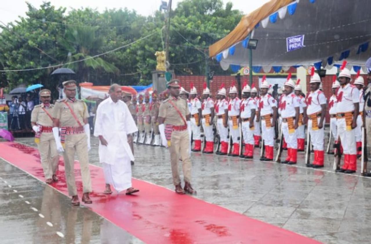 கொட்டும் மழையிலும் புதுச்சேரி கடற்கரை சாலையில் கோலாகலமாக நடைபெற்ற புதுச்சேரி விடுதலை தின விழாவில் முதலமைச்சர் ரங்கசாமி தேசியக்கொடி ஏற்றி வைத்து காவல் துறையினரின் அணிவகுப்பு மரியாதையை ஏற்றுக் கொண்டார்.