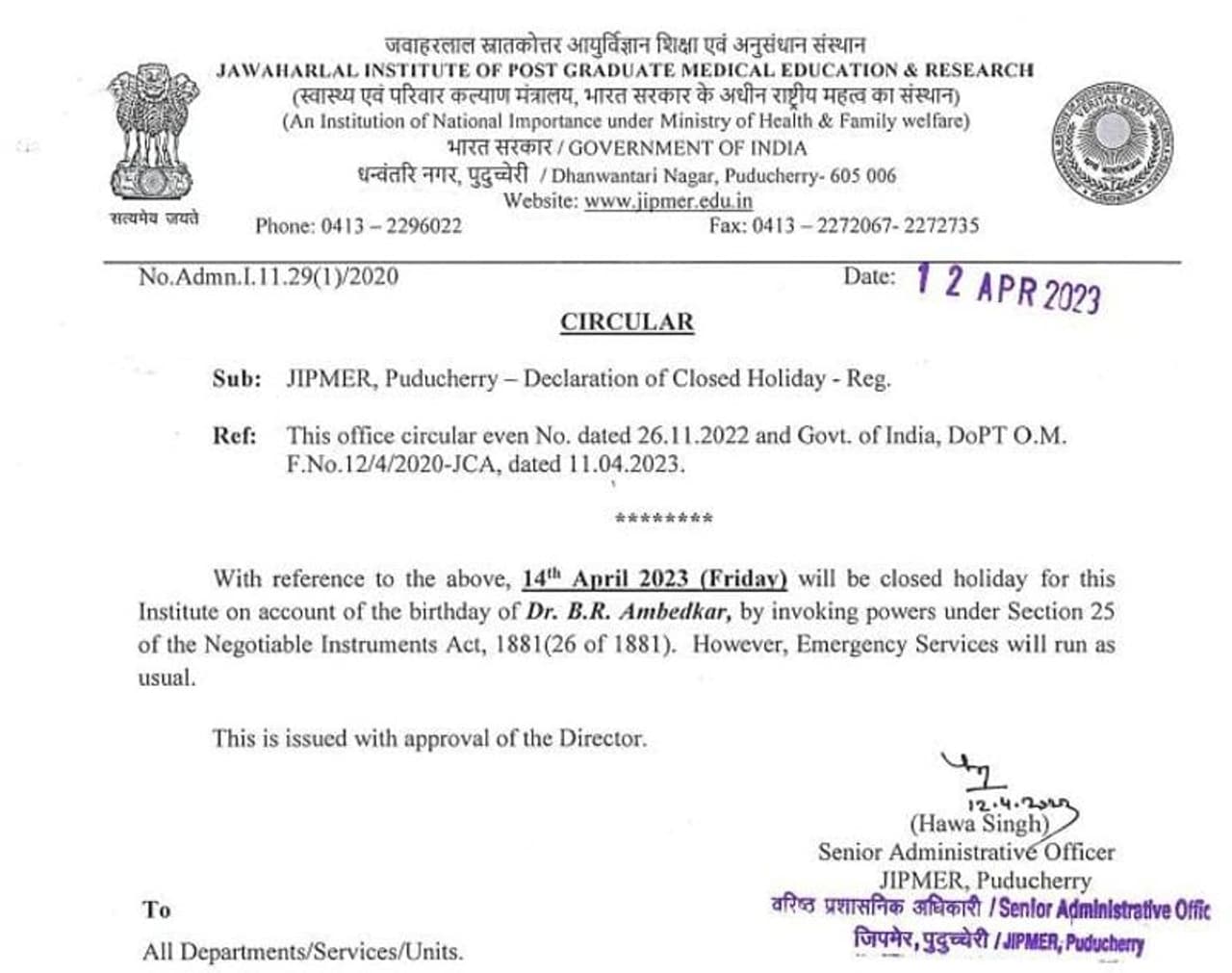 அண்ணல் அம்பேத்கர் பிறந்தநாளையொட்டி, புதுச்சேரி ஜிப்மருக்கு வரும் ஏப்ரல் 14ம் தேதி விடுமுறை அளிக்கப்பட்டுள்ளது