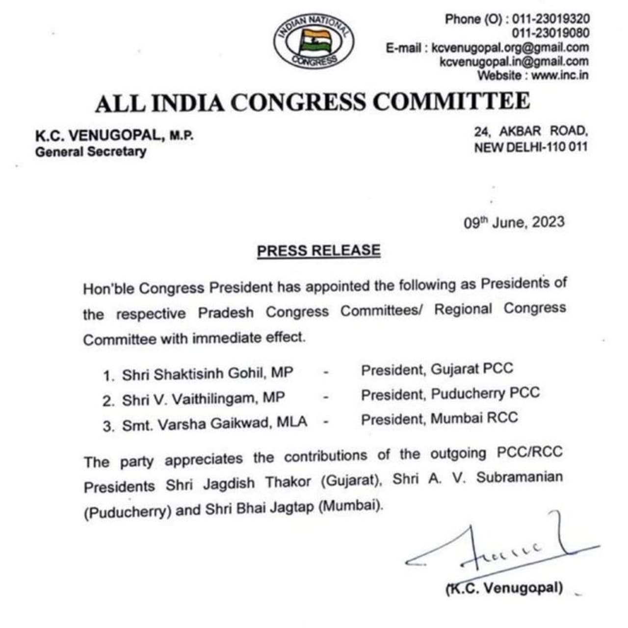 அகில இந்திய காங்கிரஸ் தலைமை வெளியிட்டுள்ள அறிவிப்பில், குஜராத் மாநில காங்கிரஸ் தலைவராக மாநிலங்களவை எம்பி ஷக்திசின் கோஹிலும், அரியானா மற்றும் டெல்லி காங்கிரஸ் தலைவராக தீபக் பபாரியாவும் நியமனம் செய்யப்பட்டுள்ளனர். மும்பை காங்கிரஸ் தலைவராக வர்ஷா கெய்க்வாட் நியமனம் செய்யப்பட்டுள்ளார்.