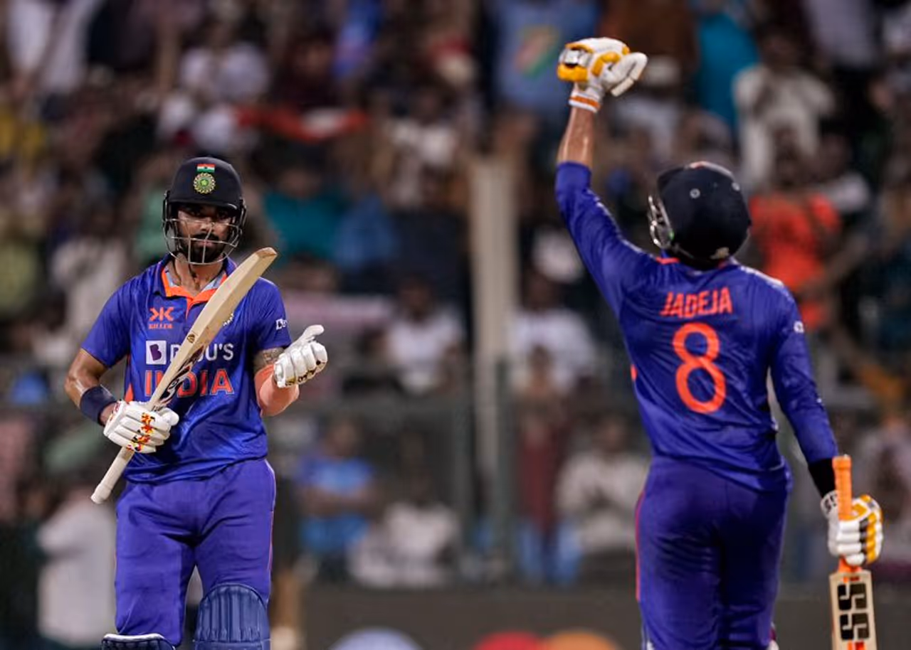 பின்னர் ஆடிய இந்தியா 45.5 ஓவர்களில் 160 ரன்கள் எடுத்து 5 விக்கெட் வித்தியாசத்தில் வெற்றி பெற்றது. இதில், அதிகபட்சமாக சச்சின் டெண்டுல்கர் 44 ரன்கள் சேர்த்து ஆட்டமிழந்தார். ரோகித் சர்மா 39 ரன்களும், எம் எஸ் தோனி 17 ரன்களும் எடுத்து கடைசி வரை அவுட்டாகாமல் இருந்தனர். இதே போன்று, நேற்றைய போட்டியில் 189 ரன்களை வெற்றி இலக்காக கொண்ட இந்தியா ஆடியது. இதில், தொடக்க வீரர்கள் வரிசையாக ஆட்டமிழந்தனர். பின்னர் ஜோடி சேர்ந்த கேஎல் ராகுல் மற்றும் ரவீந்திர ஜடேஜா இருவரும் 100 ரன்களுக்கு மேல் பார்ட்னர்ஷிப் குவித்தனர்.