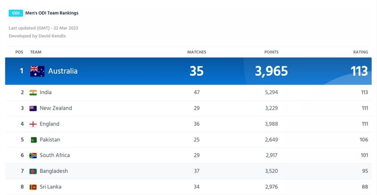 இந்தியாவுக்கு எதிரான கடைசி ஒரு நாள் போட்டியில் வெற்றி பெற்று தொடரை 2-1 என்று கைப்பற்றிய ஆஸ்திரேலியா ஆண்கள் ODI அணிகளின் தரவரிசை பட்டியலில் நம்பர் ஒன் இடம் பிடித்துள்ளது.