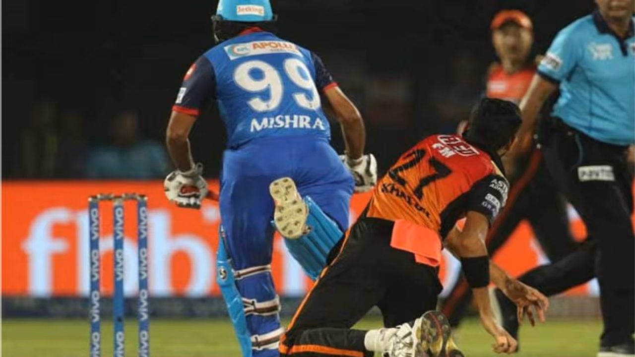 கடைசி ஓவரில் டெல்லி அணியின் வெற்றிக்கு வெறும் 5 ரன்கள் மட்டுமே தேவைப்பட்ட நிலையில் முதல் மூன்று பந்துகளில் 3 ரன்கள் எடுக்கப்பட்டது. நான்காவது பந்தை எதிர்கொண்ட அமித் மிஷ்ரா, பந்தை அடிக்காமல் மிஸ் செய்தார். ஆனாலும் ஒரு ரன் ஓடினர். அப்போது பவுலிங் முனையை நோக்கி விக்கெட் கீப்பர் சஹா த்ரோ செய்தார். அந்த பந்தை பவுலரான கலீல் அகமது பிடித்து ரன் அவுட் செய்ய முயன்றார். ஆனால் கலீல் அகமதுவால் ஸ்டம்பிற்கு நேராக வீசவிடாமல் அவரை தொந்தரவு செய்யும் விதமாக ஸ்டம்பிற்கு நேராக வேண்டுமென்றே ஓடினார் அமித் மிஷ்ரா. அந்த பந்தை கலீல் ஸ்டம்பில் அடிக்கவில்லை. எனினும் அவர் ஃபீல்டரை தொந்தரவு செய்தது உறுதியானதால் அவருக்கு அவுட் வழங்கப்பட்டது.