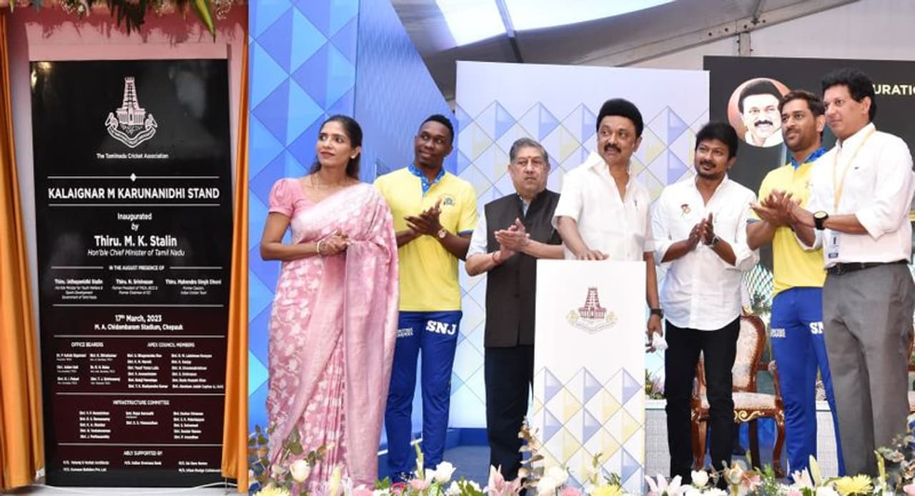 இந்த நிலையில் தான், சேப்பாக்கம் மைதானத்தில் புதிதாக கட்டப்பட்டுள்ள 2 புதிய ஸ்டாண்டுகளை முதல்வர் மு.க.ஸ்டாலின் இன்று திறந்து வைத்துள்ளார். இதற்கு கலைஞர் எம் கருணாநிதி ஸ்டாண்டு என்று பெயர் வைக்கப்பட்டுள்ளது. இந்த நிகழ்ச்சியில் இளைஞர் நலன, விளையாட்டுத் துறை அமைச்சர் உதயநிதி ஸ்டாலின், முன்னாள் ஐசிசி சேர்மன் சீனிவாசன், சென்னை சூப்பர் கிங்ஸ் அணியின் கேப்டன் எம்எஸ் தோனி, சிஎஸ்கே அணியின் பவுலிங் கோச் டுவைன் பிராவோ, தமிழ்நாடு கிரிக்கெட் சங்க தலைவர் அசோக் சிகாமணி மற்றும் அமைச்சர்கள் உள்பட பலரும் கலந்து கொண்டனர். இந்த 2 புதிய ஸ்டாண்டுகள் திறக்கப்பட்ட பிறகு இங்கு 40 ஆயிரம் ரசிகர்கள் அமர்ந்து கிரிக்கெட் பார்க்க முடியும் என்று கூறப்பட்டுள்ளது.