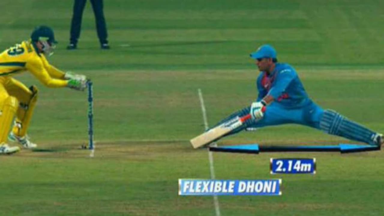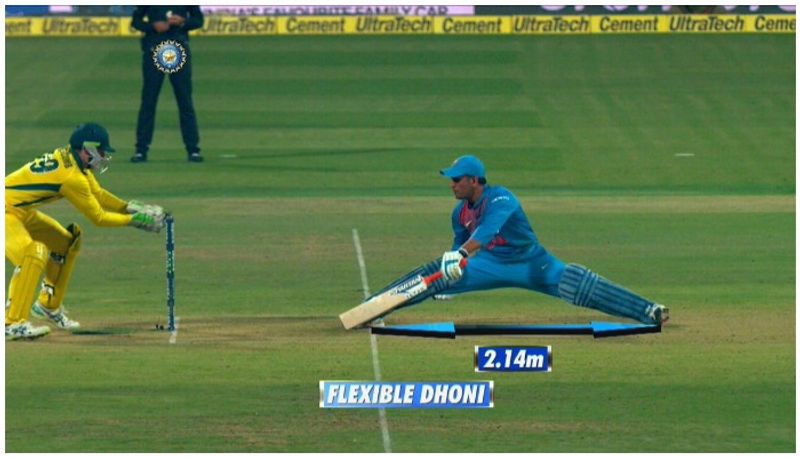 இந்நிலையில், நேற்றைய போட்டியில் தோனி பேட்டிங் ஆடியபோது ஆடம் ஸாம்பா வீசிய 12வது ஓவரில் ஒரு பந்தை தோனி இறங்கிவந்தார். அதனால் பந்தை விலக்கி வீசினார் ஸாம்பா. அதைப்பிடித்து விக்கெட் கீப்பர் ஸ்டம்பிங் செய்ய முயன்றார். ஆனால் அதற்கு இடமளிக்காத தோனி, காலை அகற்றி கிரீஸை தொட்டார். அப்போது அவரது கால்கள் 2.14 மீட்டர் இடைவெளிக்கு விரிந்தன. தோனியின் உடல் நெகிழ்வுத்தன்மை அனைவரையும் வியப்பில் ஆழ்த்தியது. தோனியின் வயதை சுட்டிக்காட்டி அவரை விமர்சிப்பவர்களுக்கு இது பதிலடியாக அமைந்தது.