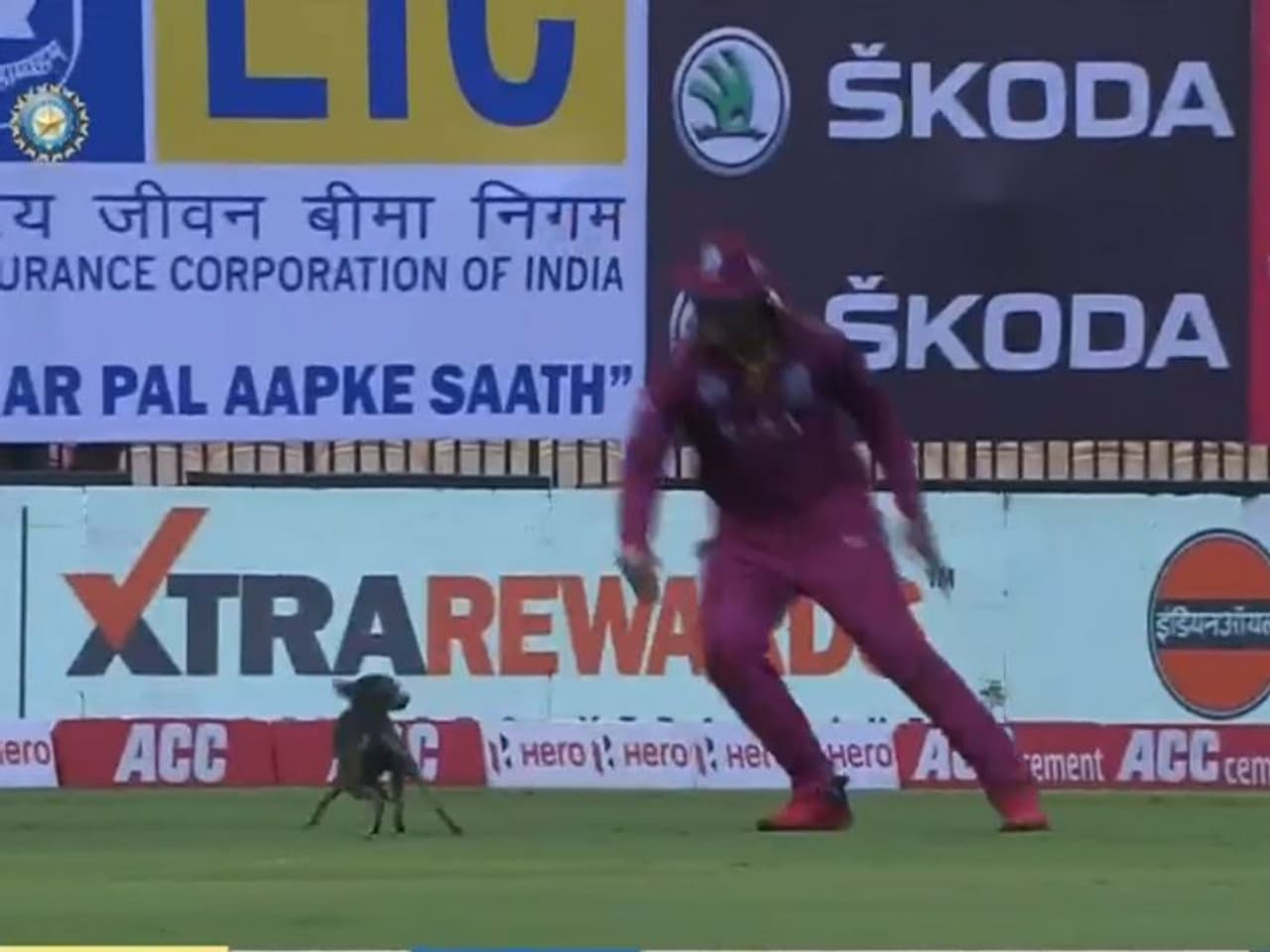 இந்தியா - வெஸ்ட் இண்டீஸ் இடையே சென்னை சேப்பாக்கத்தில் நடந்துவரும் முதல் ஒருநாள் போட்டியில், ஆட்டத்தின் இடையே, நாய் ஒன்று மைதானத்திற்குள் புகுந்து அனைவருக்கும் ஆட்டம் காட்டியது.