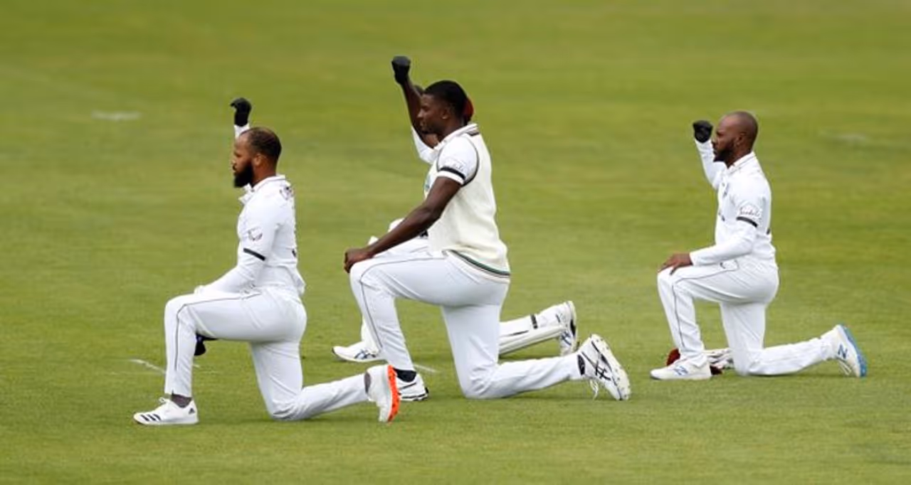 இங்கிலாந்து மற்றும் வெஸ்ட் இண்டீஸ் வீரர்கள், முதல் டெஸ்ட் போட்டி ஆட தொடங்குவதற்கு முன்பாக, மண்டியிட்டு, கருப்பின மக்கள் மீதான இனவெறிக்கு எதிர்ப்பு தெரிவித்தனர்.