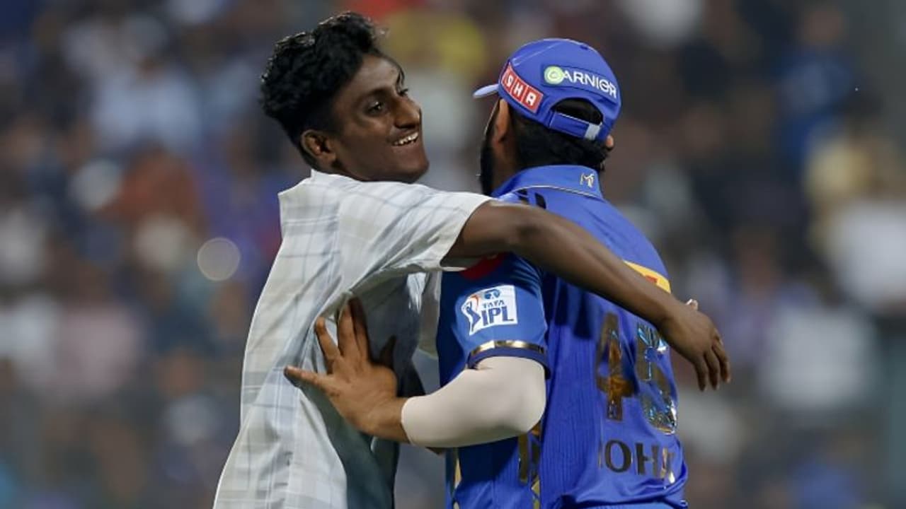 ராஜஸ்தான் ராயல்ஸ் அணிக்கு எதிரான போட்டியின் போது பீல்டிங்கில் நின்றிருந்த ரோகித் சர்மாவை கட்டிப்பிடிக்க ரசிகர் ஒருவர் மைதானத்திற்குள் ஓடி வந்து அவரை கட்டிப்பிடித்து சென்ற வீடியோ வைரலாகி வருகிறது.