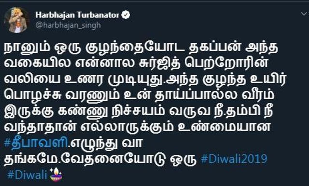 கடந்த 40 மணி நேரத்திற்கு மேலாக ஆழ்துளைக் கிணற்றில் சிக்கியிருக்கும் குழந்தை சுர்ஜித் மீண்டு வரவேண்டும் என்று எல்லோரும் பிரார்த்தனை செய்துவரும் நிலையில் 'நீ வந்தா தான் உண்மையான தீபாவளி. என்று கிரிக்கெட் வீரர் ஹர்பஜன் சிங் பதிவிட்டுள்ளார்.