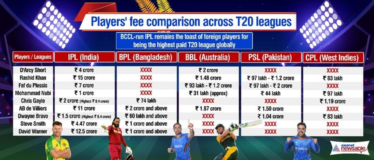 மற்ற டி20 லீக் தொடர்களில் வீரர்களுக்கு வழங்கப்படும் ஊதியத்துடன் ஐபிஎல் ஊதியத்தை ஒப்பிட்டால், இடையேயான வித்தியாசம் புலப்படும்.