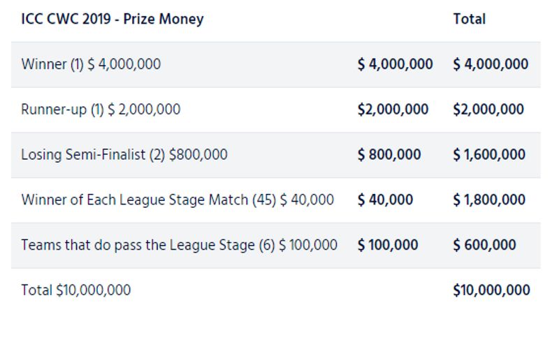 இந்நிலையில், உலக கோப்பையை வெல்லும் அணி, இறுதி போட்டியில் தோற்கும் அணி என ஒட்டுமொத்தமாக பரிசுத்தொகை பட்டியலை வெளியிட்டுள்ளது ஐசிசி. அதன்படி உலக கோப்பையை வெல்லும் அணிக்கு 4 மில்லியன் டாலர்(ரூ.28 கோடி) பரிசாக வழங்கப்படும். இறுதி போட்டியில் தோற்கும் அணிக்கு 2 மில்லியன் டாலர்(ரூ.14 கோடி) பரிசுத்தொகையாக வழங்கப்படும் எனவும் அரையிறுதியில் தோற்கும் 2 அணிகளுக்கு தலா ரூ.16 லட்சம் வழங்கப்படும் எனவும் அறிவிக்கப்பட்டுள்ளது.