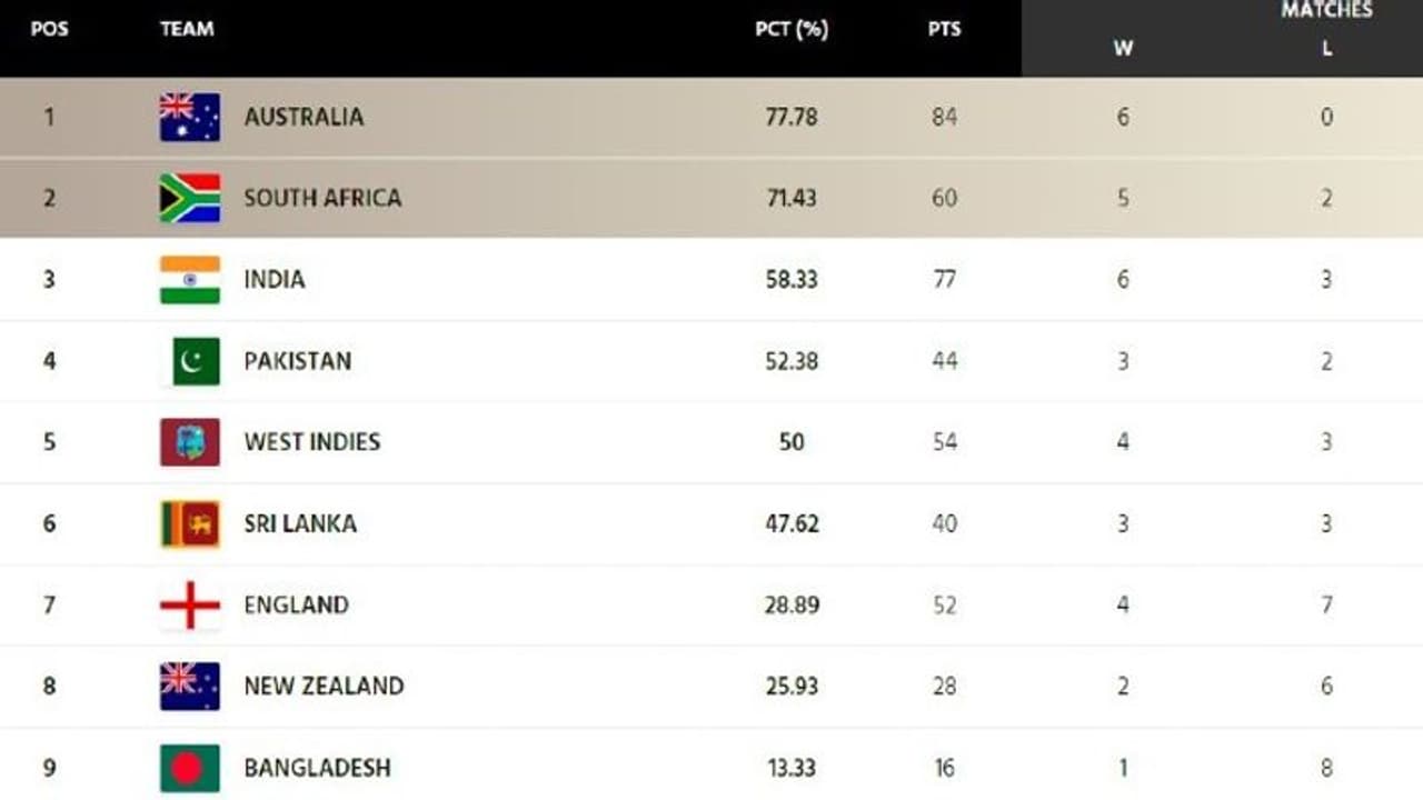 வெற்றி சதவிகிதங்களின் அடிப்படையில் புள்ளி பட்டியலில் அணிகள் வரிசைப்படுத்தப்படுகின்றன. அந்தவகையில், அதிகமான வெற்றிகளை பெற்றுவரும் ஆஸ்திரேலிய அணி புள்ளி பட்டியலில் ஆதிக்கம் செலுத்துகிறது.