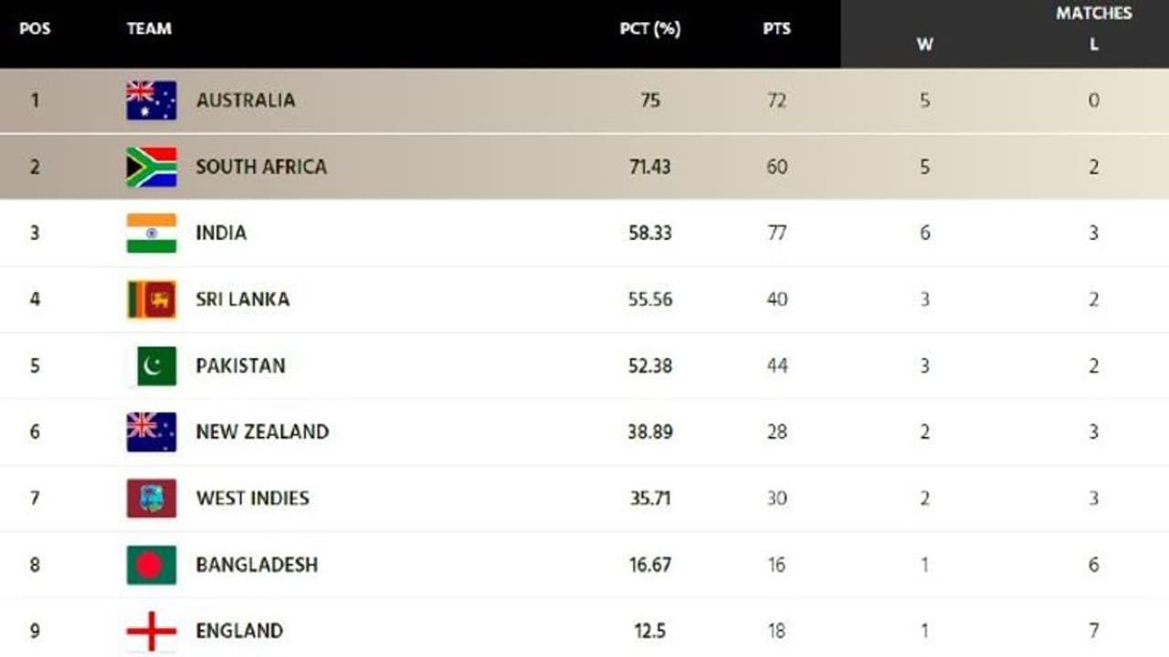 75 சதவிகித வெற்றியுடன் ஆஸ்திரேலிய அணி முதலிடத்தில் உள்ளது. 71.43 என்ற வெற்றி சதவிகிதத்துடன் தென்னாப்பிரிக்க அணி புள்ளி பட்டியலில் இரண்டாமிடத்தில் உள்ளது. 58.33 வெற்றி சதவிகிதத்துடன் இந்திய அணி 3ம் இடத்தில் உள்ளது.