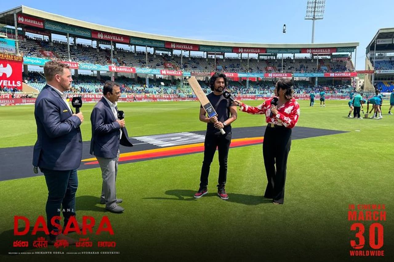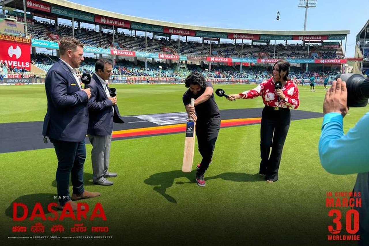 தெலுங்கு சினிமாவில் முன்னணி நடிகர்களில் ஒருவராக இருப்பவர் நடிகர் நானி. தற்போது, அறிமுக இயக்குநர் ஸ்ரீகாந்த் ஒடிலா இயக்கத்தில் உருவாகியுள்ள தசரா என்ற படத்தில் நானி நடித்துள்ளார். இதில், நானிக்கு ஜோடியாக கீர்த்தி சுரேஷ் நடித்துள்ளார். வரும் 30ஆம் தேதி இந்தப் படம் உலகம் முழுவதும் வெளியாக இருக்கிறது. இந்த நிலையில், இந்தியா மற்றும் ஆஸ்திரேலியா அணிகளுக்கு இடையிலான 2ஆவது ஒரு நாள் போட்டிக்கு நானி தனது படம் புரோமோஷனுக்காக வருகை தந்துள்ளார்.