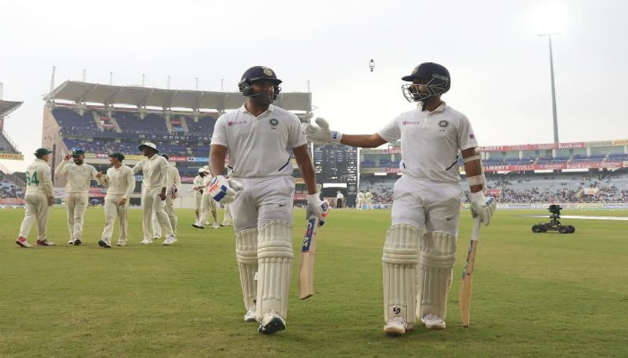 முதல் 3 விக்கெட்டுகள் விரைவில் விழுந்துவிட்டதால், இவர்கள் இருவரும் ஜோடி சேர்ந்த ஆரம்பத்தில் மிகவும் நிதானமாக ஆடினர். முதல் நாளான நேற்றைய ஆட்டத்தின் உணவு இடைவேளைக்கு பின்னர், இரண்டாவது செசனில் இருவருமே பவுண்டரியும் சிக்ஸருமாக அடித்து ஆடி ஸ்கோர் செய்தனர். இருவருமே அடித்து ஆடியதால் அணியின் ஸ்கோர் மளமளவென உயர்ந்தது. ரோஹித் சர்மா அரைசதத்திற்கு பிறகு அடி வெளுத்துவிட்டார். அவருக்கு ஒத்துழைப்பு கொடுத்து ரஹானேவும் சிறப்பான ஆட்டத்தை வெளிப்படுத்தினார்.