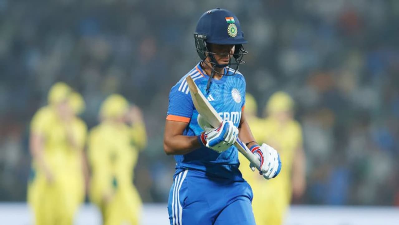கேப்டன் ஹர்மன்ப்ரீத் கவுர் பெரிதாக சோபிக்கவில்லை. அவர் 3 ரன்களில் ஆட்டமிழந்தார். முதல் 8 ஓவர்களில் 2 விக்கெட் இழப்பிற்கு 60 ரன்கள் எடுத்திருந்த இந்திய மகளிர் அணி அடுத்து 30 ரன்கள் அடிப்பதற்குள் 3 விக்கெட்டுகளை இழந்து தடுமாறியது. நிதானமாக விளையாடி வந்த ஸ்மிருதி மந்தனா 29 ரன்களில் ஆட்டமிழந்தார்.