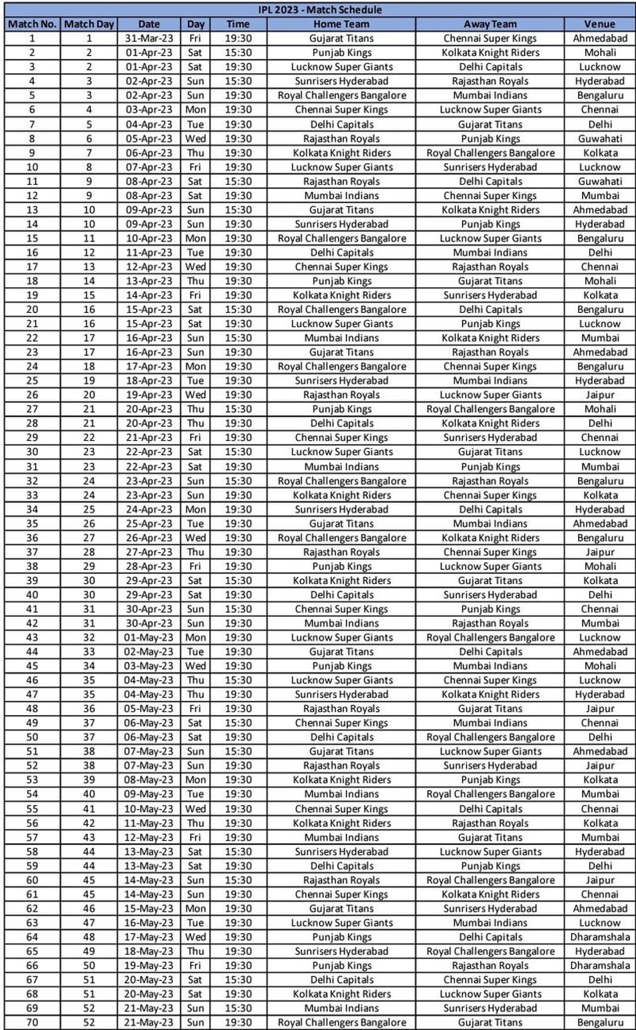 வரும் மார்ச் 31ம் தேதி தொடங்கும் முதல் போட்டியில் நடப்பு சாம்பியன் குஜராத் டைட்டன்ஸ் அணி, 4 முறை சாம்பியன் சிஎஸ்கே அணியுடன் மோதுகிறது. இந்த முதல் போட்டி அகமதாபாத்தில் நடக்கிறது. இறுதிப்போட்டியும் அகமதாபாத் நரேந்திர மோடி ஸ்டேடியத்தில் தான் நடக்கிறது.