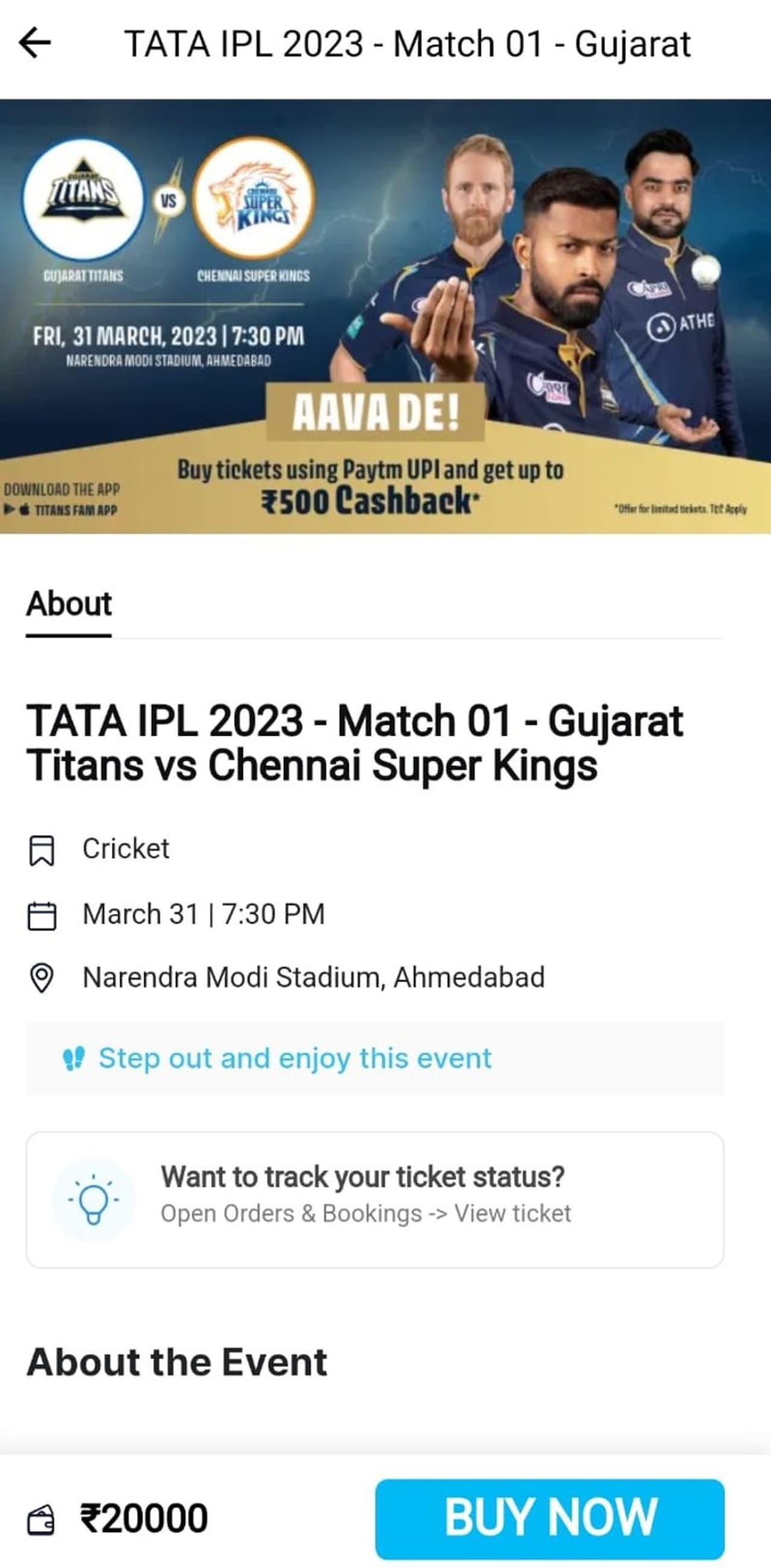 2023 ஐபிஎல் டிக்கெட்டுகளை முன்பதிவு செய்வது Paytm மிகவும் எளிமையான ஒன்று. நிகழ்வுப் பகுதியைக் கிளிக் செய்து, Paytm முகப்புப் பக்கத்திலிருந்து Tata IPL 2023ஐத் தேர்ந்தெடுப்பதுதான் செல்ல வழி. ஒருவர் தங்களுடைய சீட் விருப்பங்களைத் தேர்ந்தெடுக்கலாம், அது அவர்களின் நிலைக்கு ஏற்ப டிக்கெட் விலையில் வேறுபடலாம்.