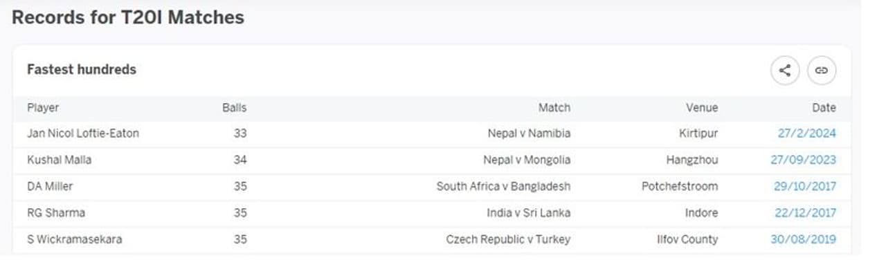 நேபாள் அணிக்கு எதிரான முத்தரப்பு டி20 தொடரில் நமீபியா வீரர் லோஃப்டி ஈடன் 33 பந்துகளில் சதம் அடித்து ரொகித் சர்மாவின் சாதனையை முறியடித்துள்ளார்.
