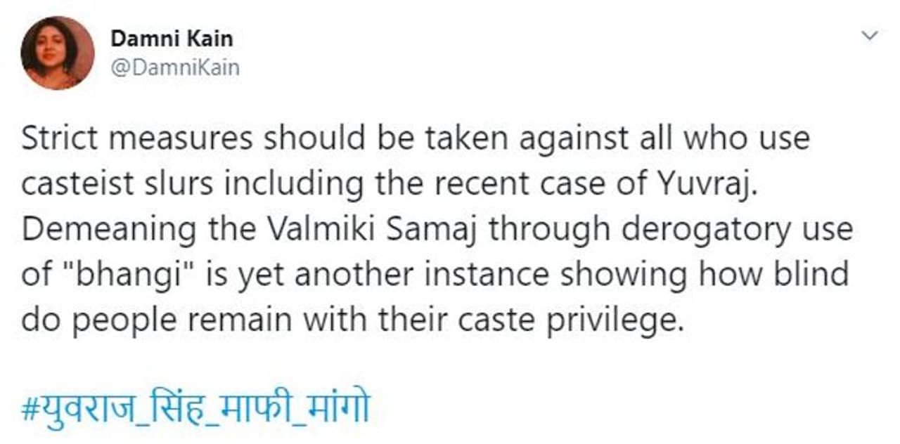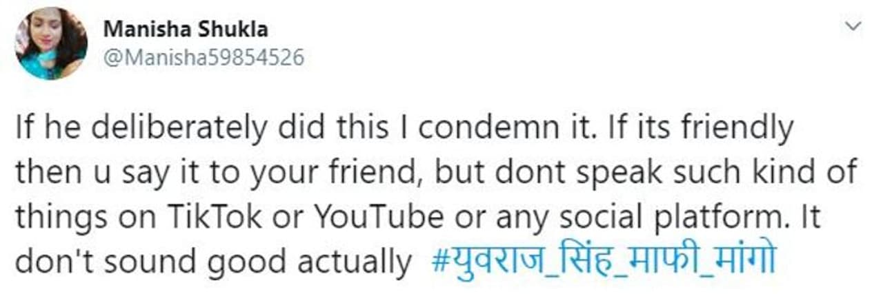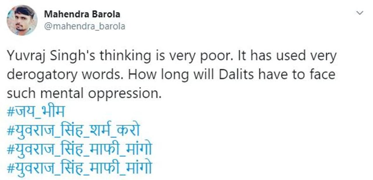அதற்காக மன்னிப்பு கேள் யுவராஜ் சிங் என்ற ஹேஷ்டேக்கை உருவாக்கி டிரெண்டும் செய்தனர் ரசிகர்கள். அந்த ஹேஷ்டேக்கை பயன்படுத்தி, யுவராஜ் சிங்கை மன்னிப்பு கேட்குமாறு ரசிகர்கள் தொடர்ந்து வலியுறுத்திவருகின்றனர்.