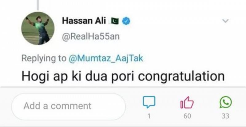 இந்நிலையில், இந்திய அணியின் வெற்றிக்கு வாழ்த்து தெரிவித்த பெண் பத்திரிகையாளர் ஒருவர், இந்திய அணி உலக கோப்பையை வெல்ல வாழ்த்துகள் என்று டுவீட் செய்திருந்தார். அவரது டுவீட்டுக்கு ரீடுவீட் செய்த பாகிஸ்தான் ஆல்ரவுண்டர் ஹசன் அலி, உங்கள் எண்ணம் நிறைவேற, இந்திய அணி கோப்பையை வெல்ல வாழ்த்துக்கள் என்று பதிவிட்டிருந்தார்.