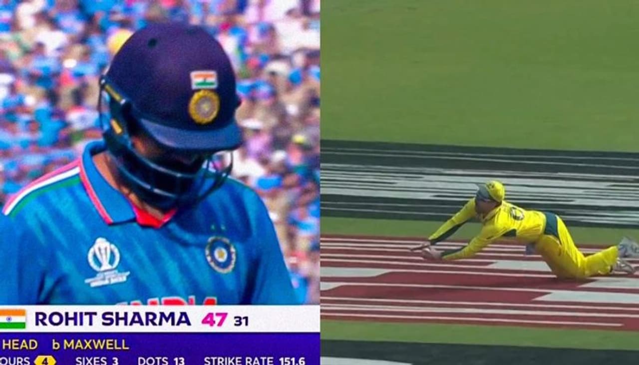 பின்னர், விராட் கோலி களமிறங்கினார். இதில், அந்த ஓவரின் கடைசி பந்தில் ரோகித் சர்மா சிக்ஸர் அடித்தார். இந்த ஆண்டில் அதிக ரன்கள் பார்ட்னர்ஷிப் கொடுத்தவர்களில் ரோகித் சர்மா மற்றும் சுப்மன் கில் இருவரும் இணைந்து 1523 ரன்கள் எடுத்துள்ளனர். கடைசியாக கிளென் மேக்ஸ்வெல் வீசிய 10ஆவது ஓவரில் ரோகித் சர்மா ஒரு சிக்ஸர், ஒரு பவுண்டரி அடித்த நிலையில், அடுத்த பந்தை சிக்ஸருக்கு அடிக்க முயற்சித்த நிலையில், டிராவிஸ் ஹெட்டிடம் கேட்ச் கொடுத்து ஆட்டமிழந்தார். சர்மா 31 பந்துகளில் 4 பவுண்டரி, 3 சிக்ஸர்கள் உள்பட 47 ரன்கள் எடுத்து ஆட்டமிழந்தார். இதற்கு முன்னதாக ஆஸ்திரேலியாவிற்கு எதிரான லீக் போட்டியில் சர்மா ரன் ஏதும் எடுக்காமல் ஆட்டமிழந்தார் என்பது குறிப்பிடத்தக்கது.