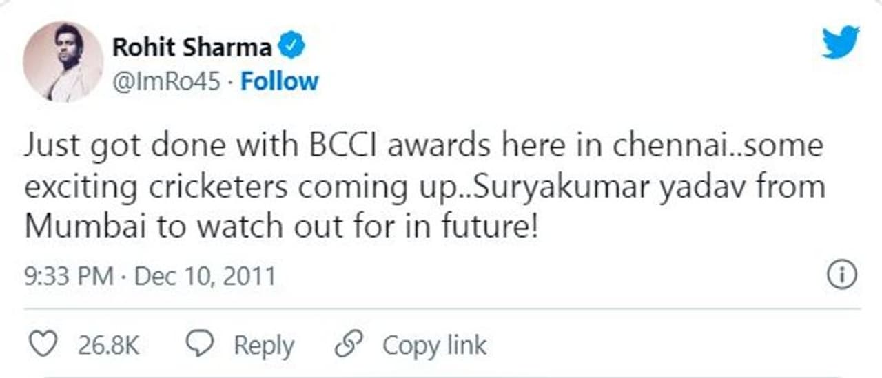 இந்நிலையில், சூர்யகுமார் யாதவை பற்றி ரோஹித் சர்மா11 ஆண்டுகளுக்கு முன் பதிவிட்ட டுவீட் இப்போது வைரலாகிவருகிறது. தொலைநோக்கு பார்வையுடைய ரோஹித் சர்மா என்று ரசிகர்கள் ரோஹித்தை புகழ்ந்துவருகின்றனர்.