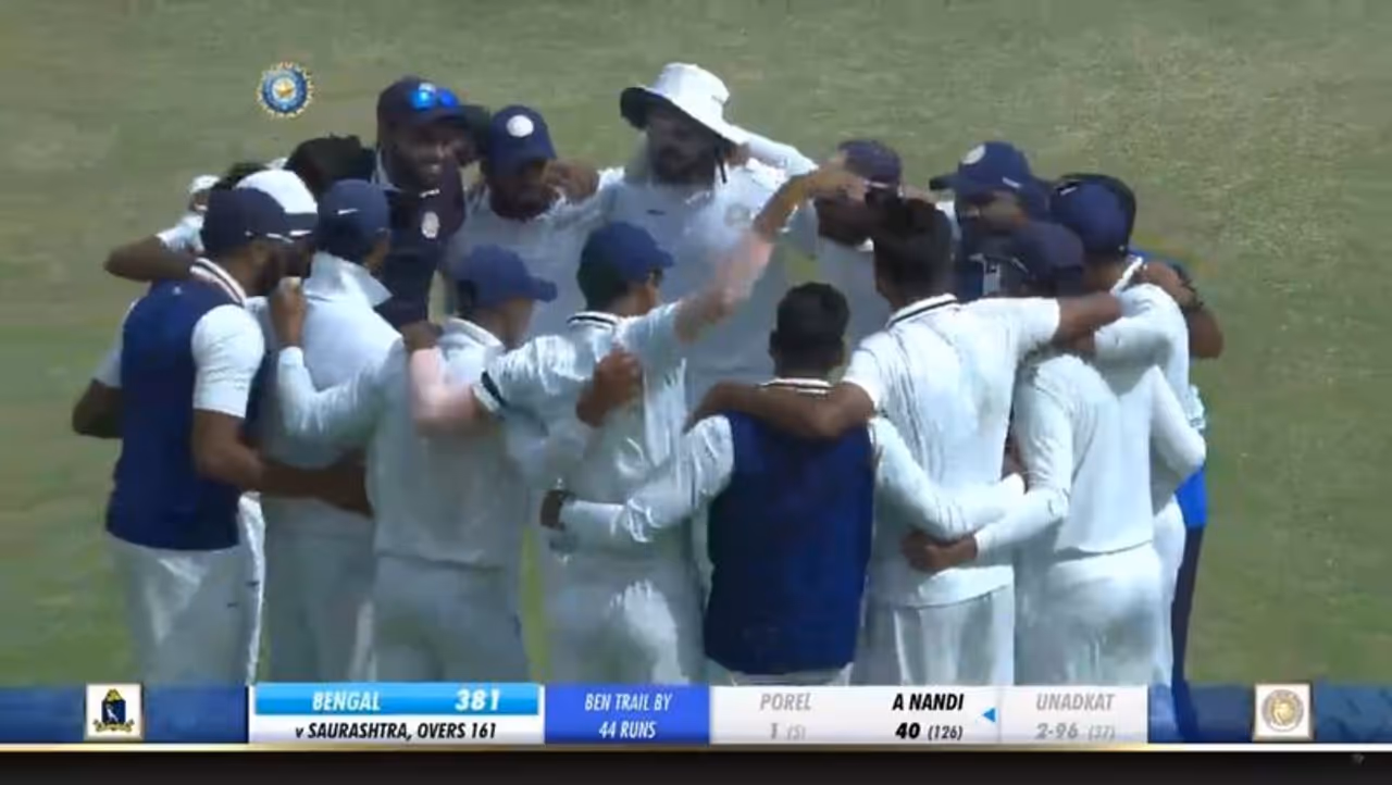 பெங்கால் அணியின் கையில் 4 விக்கெட்டுகள் இருந்த நிலையில், கோப்பையை வெல்ல அந்த அணிக்கு வெறும் 72 ரன்கள் மட்டுமே தேவைப்பட்டது. ஆனால் சவுராஷ்டிரா கேப்டன் ஜெய்தேவ் உனாத்கத்தின் அருமையான பவுலிங்கின் விளைவாக, 381 ரன்களுக்கே பெங்காலை சுருட்டியது சவுராஷ்டிரா. கடைசி நாளான இன்றைய ஆட்டம் தொடங்கிய சிறிது நேரத்தில் மஜூம்தரை 63 ரன்களுக்கு வீழ்த்திய உனாத்கத், அதே ஓவரின் கடைசி பந்தில் ஆகாஷ் தீப்பை ரன் அவுட் செய்தார். அர்னாப் நந்தி ஒருமுனையில் நிலைத்து நின்று 40 ரன்கள் அடித்து கடைசி வரை ஆட்டமிழக்காமல் களத்தில் நிற்க, முகேஷ் குமார் மற்றும் இஷான் போரெல் ஆட்டமிழந்தனர். கடைசி விக்கெட்டான இஷான் போரெலையும் உனாத்கத் தான் வீழ்த்தினார்.