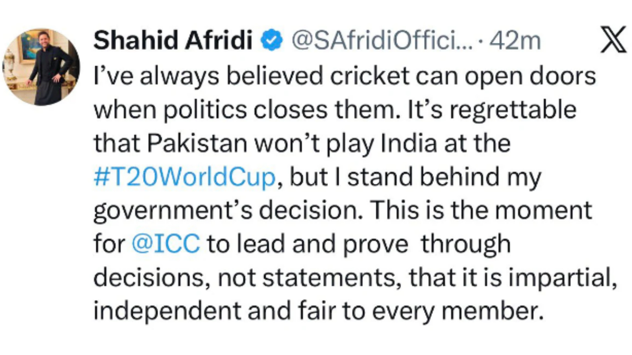 அரசியல் உறவுகள் மோசமடையும் போது, கிரிக்கெட்டால் கதவுகளைத் திறக்க முடியும் என்று அவர் நம்புவதாகக் கூறினார். ''அரசியல் கதவுகளை மூடும்போது, கிரிக்கெட்டால் அவற்றை திறக்க முடியும் என்று நான் எப்போதும் நம்புகிறேன். உலகக் கோப்பையில் பாகிஸ்தான் இந்தியாவுக்கு எதிராக விளையாடாது என்பது வருத்தமளிக்கிறது. ஆனாலும், எனது அரசாங்கத்தின் முடிவுக்குப் பின்னால் நான் உறுதியாக நிற்கிறேன். ஐசிசி வெறும் அறிக்கைகளை வெளியிடுவதை விடுத்து, தாங்கள் நடுநிலையானவர்கள் மற்றும் சுதந்திரமானவர்கள் என்பதை முடிவுகளின் மூலம் நிரூபிக்க வேண்டிய நேரம் இது,'' என்று அப்ரிடி பதிவிட்டுள்ளார்.