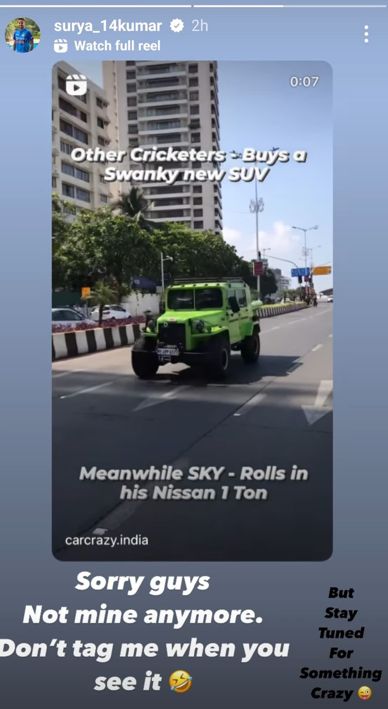 இதையடுத்து, வரும் 31 ஆம் தேதி ஐபிஎல் தொடரின் 16ஆவது சீசன் தொடங்க இருக்கிறது. இந்த நிலையில், மும்பையில் ஹல்க் எனப்படும் நிசான் 1 டன் காரில் சூர்யகுமார் யாதவ் சென்றதாக ஒரு வீடியோசமூக வலைதளங்களில் வைரலானது. அந்த வீடியோவை பகிர்ந்து மன்னிக்கவும், அது என்னுடையது அல்ல. அதை பார்த்ததும் என்னை டேக் செய்து பதிவிட வேண்டாம் என்று பதிவிட்டுள்ளார். மேலும், உற்சாகமான அப்டேட் விரைவில் வெளிவரும் என்றும், கிரேஸியான பதிவிற்கு காத்திருங்கள் என்றும் பதிவிட்டுள்ளார்.
