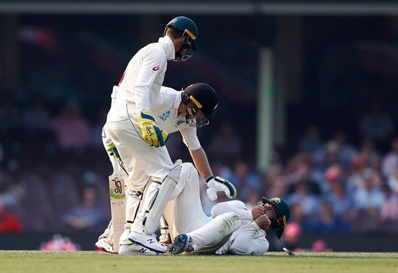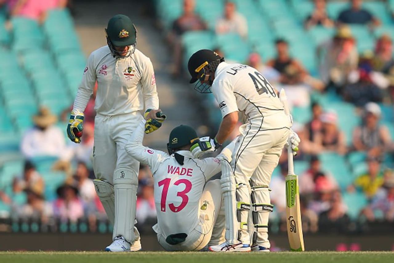 நியூசிலாந்து அணி ஆடும்போது, 28வது ஓவரை லபுஷேன் வீசினார். அந்த ஓவரை டாம் லேதம் எதிர்கொண்டார். அப்போது, மேத்யூ வேட் ஷார்ட் லெக் திசையில் ஃபீல்டிங் செய்தார். அந்த ஓவரில் ஒரு பந்தை லபுஷேன் ஷார்ட் பிட்ச்சாக வீச, அதை ஓங்கி லெக் திசையில் அடித்தார் டாம் லேதம். லேதம் ஓங்கி அடித்த பந்து, ஷார்ட் லெக் திசையில் நின்ற மேத்யூ வேடின் கையில் பட்டு, ஹெல்மெட்டில் அடித்தது. அப்படியே சரிந்து விழுந்தார் வேட்.