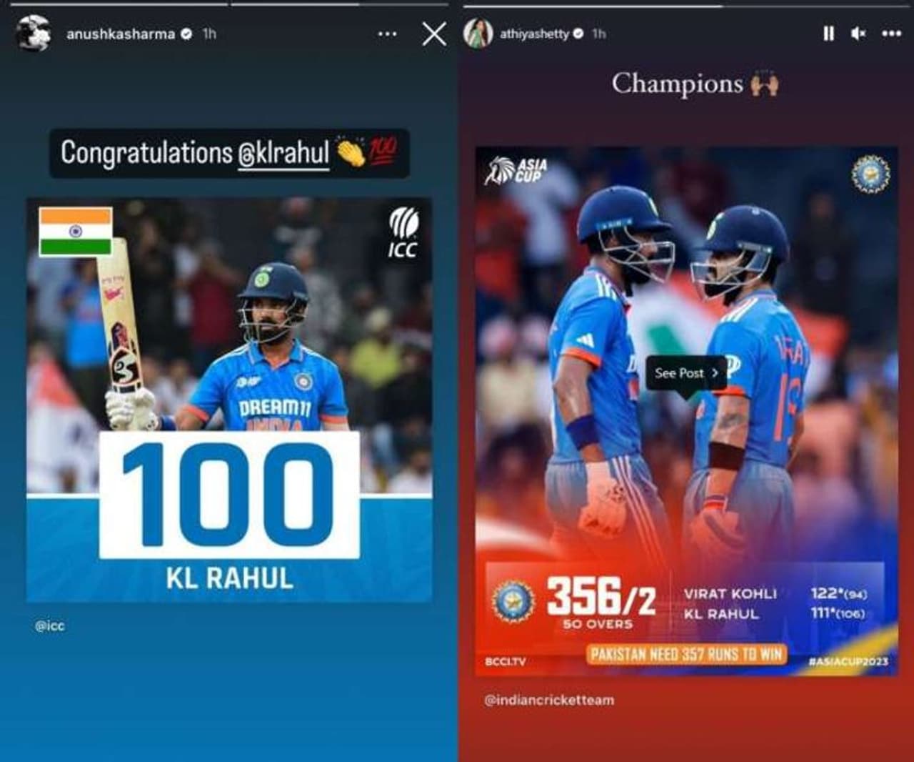 இறுதியாக இந்திய அணி 50 ஓவர்கள் முடிவில் 2 விக்கெட் இழப்பிற்கு 356 ரன்கள் குவித்தது. இதில், கேஎல் ராகுல் 111 ரன்னுடனும், விராட் கோலி 122 ரன்னுடனும் களத்தில் இருந்தனர். இந்த நிலையில், விராட் கோலி மற்றும் கேஎல் ராகுல் ஆகியோருக்கு அவர்களது மனைவியான அனுஷ்கா சர்மா மற்றும் அதியா ஷெட்டி ஆகியோர் வாழ்த்து தெரிவித்துள்ளனர்.