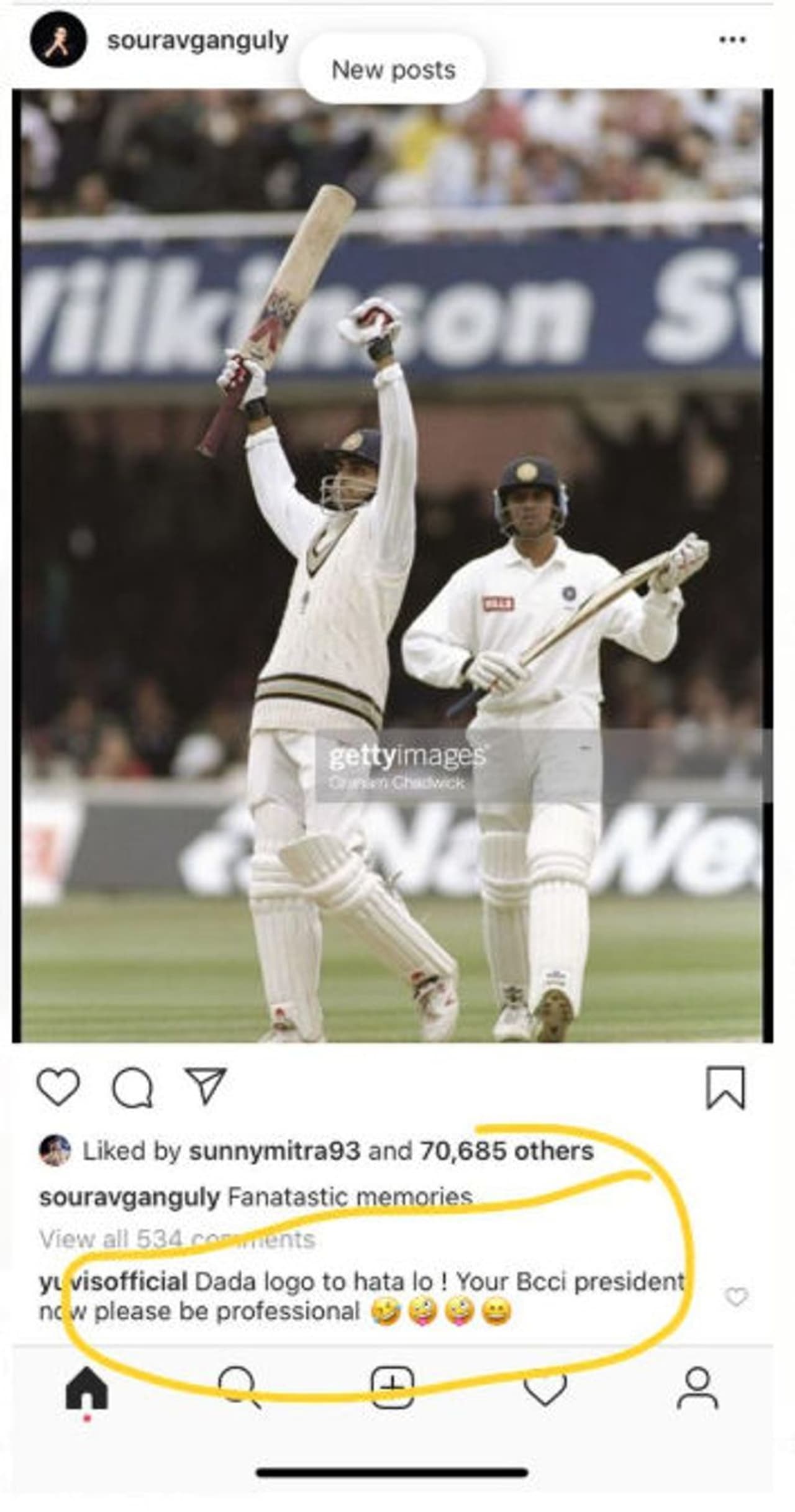 அதைக்கண்ட யுவராஜ் சிங், கங்குலி, வாட்டர் மார்க்குடன் அந்த புகைப்படத்தை பதிவிட்டிருந்ததை சுட்டிக்காட்டி, தாதா, நீங்கள் இப்போது பிசிசிஐ தலைவர். எனவே கொஞ்சமாவது ப்ரொஃபசனலாக நடந்துகொள்ளுங்கள் என்று பதிவிட்டுள்ளார்.