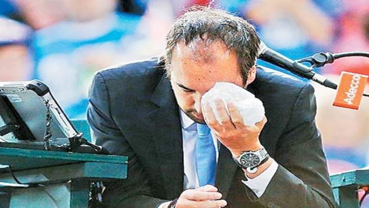 அப்போது அவர் தன்னிடம் இருந்த பந்தை வேகமாக வெளியில் அடித்தார். ஆனால் அந்த பந்து எதிர்பாராதவிதமாக பிரதான நடுவர் (சேர் அம்பயர்) அர்னாட் கேபாஸின் இடது கண்ணில் பலமாகத் தாக்கியது.