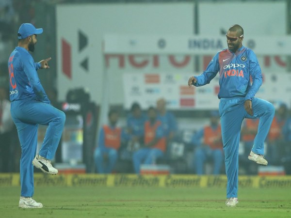 பொதுவாக கேட்ச் பிடித்தால் ரசிகர்களை நோக்கி தொடையை தட்டி மகிழ்ச்சியை கொண்டாடும் தவான், நேற்றைய போட்டியில் கேட்ச் எதுவும் பிடிக்கவில்லை. எனினும் போட்டி முடிந்து தொடர் நாயகன் விருதை பெற மேடைக்கு சென்ற தவான், மேடையில் நின்ற சிறுவனை தூக்கி விளையாடினார். பின்னர் தொடர் நாயகன் விருதுடன் ரசிகர்களை நோக்கி தொடையை தட்டி தனது அக்மார்க் கொண்டாட்டத்தை வெளிப்படுத்தினார்.